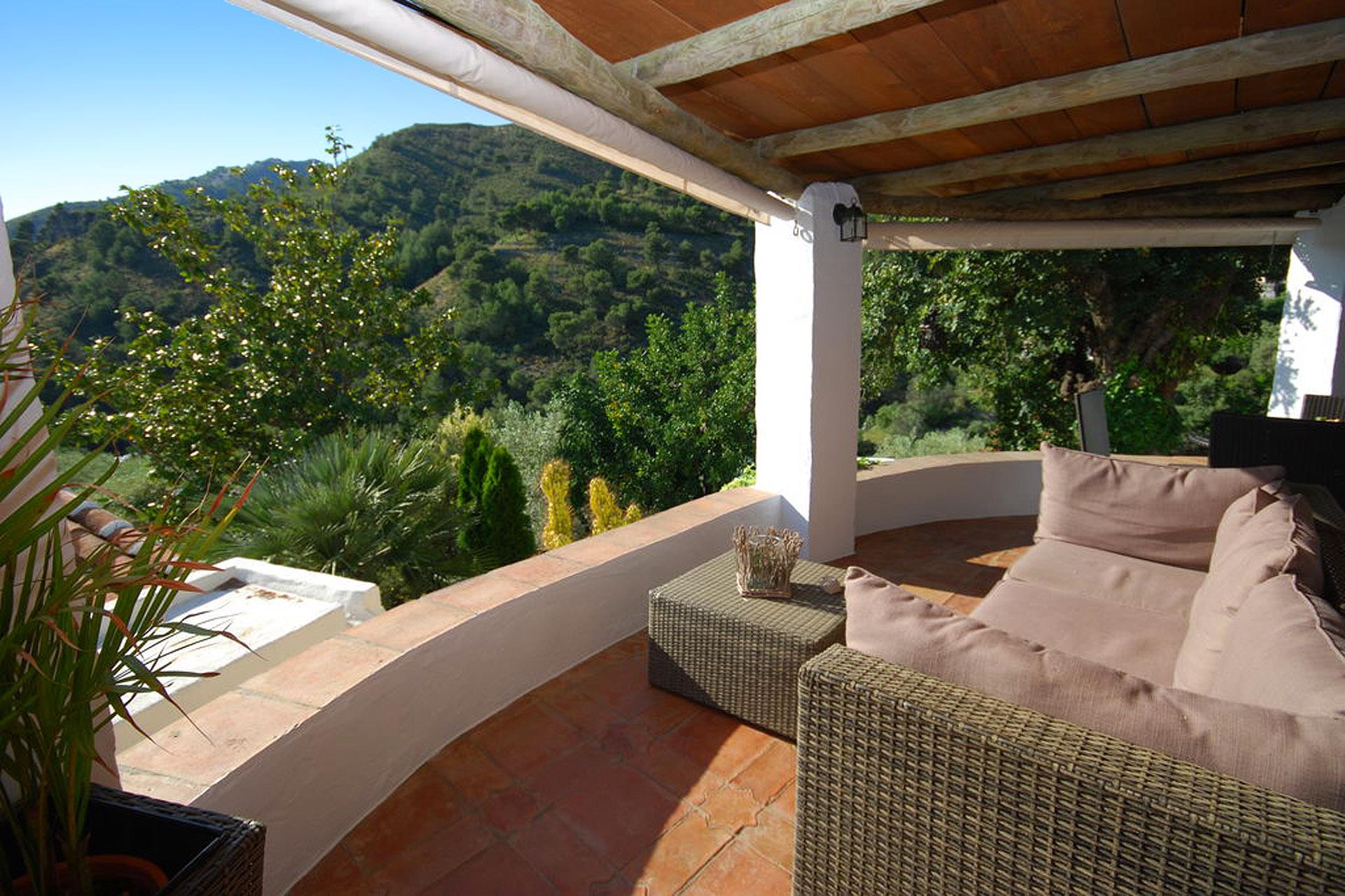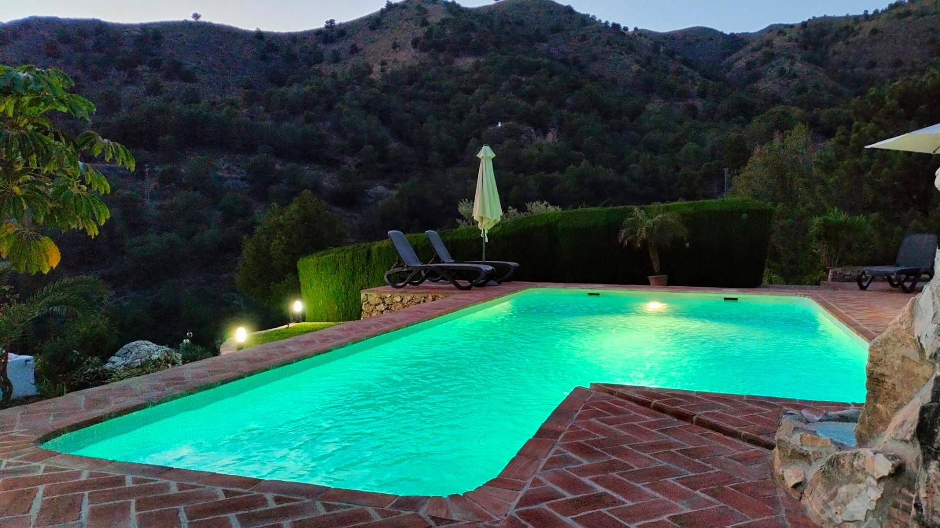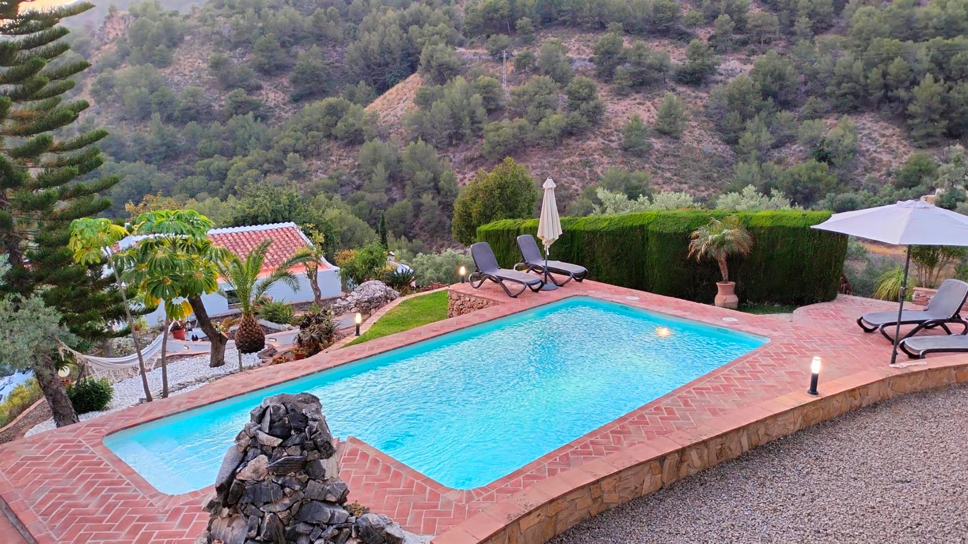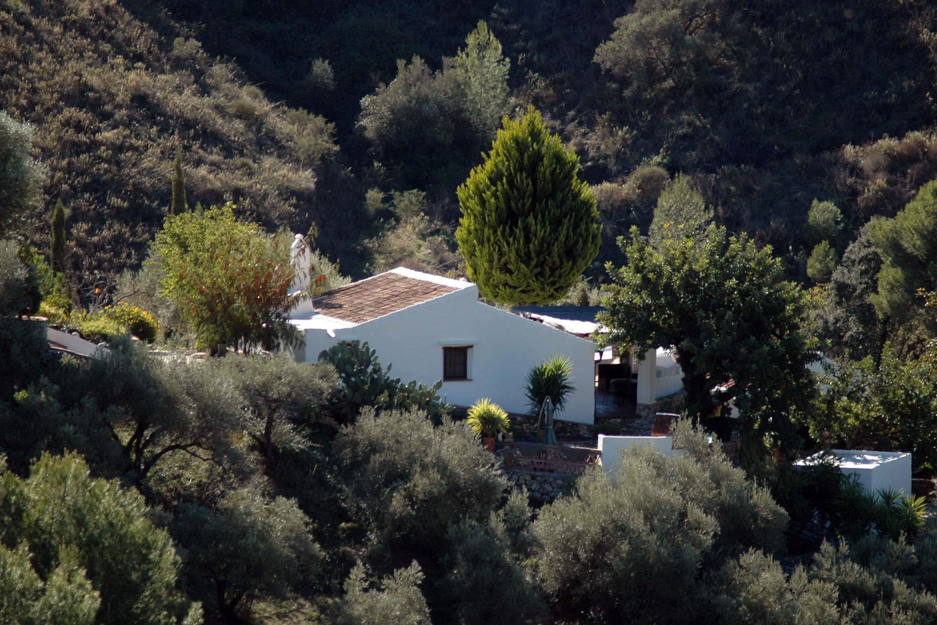 Rustiek, privé en landelijk. Dat is de essentie van deze heerlijke locatie. Na een mooie autorit door de bergen ontdekt u deze verborgen vallei, 10 minuten rijden van Frigiliana. De toegangsweg heeft een paar scherpe bochten, maar is volledig verhard en niet moeilijk om te rijden. De "cortijo" is omgeven door een grote tuin met verschillende zithoekjes met bloemen en bomen. Er is een aantrekkelijk barbecuegedeelte en een schaduwrijke veranda met meubilair. Het privé zwembad van 7 x 4 meter (met ligstoelen) ligt op een wat hoger niveau met panoramische uitzichten over het dal en over het 1 kilometer verderop gelegen buurtschap El Acebuchal, een klein dorpje met een interessante geschiedenis: nadat de inwoners in 1949 door het Franco regime waren verdreven bleef El Acebuchal lange tijd onbewoond en raakte in verval. Totdat in 1998 een nakomeling van een van de oorspronkelijke bewoners er een huis kocht en anderen aanmoedigde om de 32 huizen, het stadhuis, de kapel, de bars en de straten waaruit het dorp bestond te helpen opbouwen. Om het buurtschap weer terug te brengen in zijn oude glorie werd de renovatie zeer zorgvuldig uitgevoerd, met oog voor detail. Geen winkels hier, maar wel een bar-restaurant dat regionale specialiteiten serveert, zoals wild zwijn en geitengerechten. In Frigiliana, een van de z.g. witte dorpen en een bezoek meer dan waard, vindt u een uitgebreid aanbod aan winkels, tapasbars en restaurants. Bezoek aan Nerja (9 kilometer) is eveneens de moeite waard: u kunt er genieten van de mooiste stranden en een duikje nemen in de Middellandse zee.