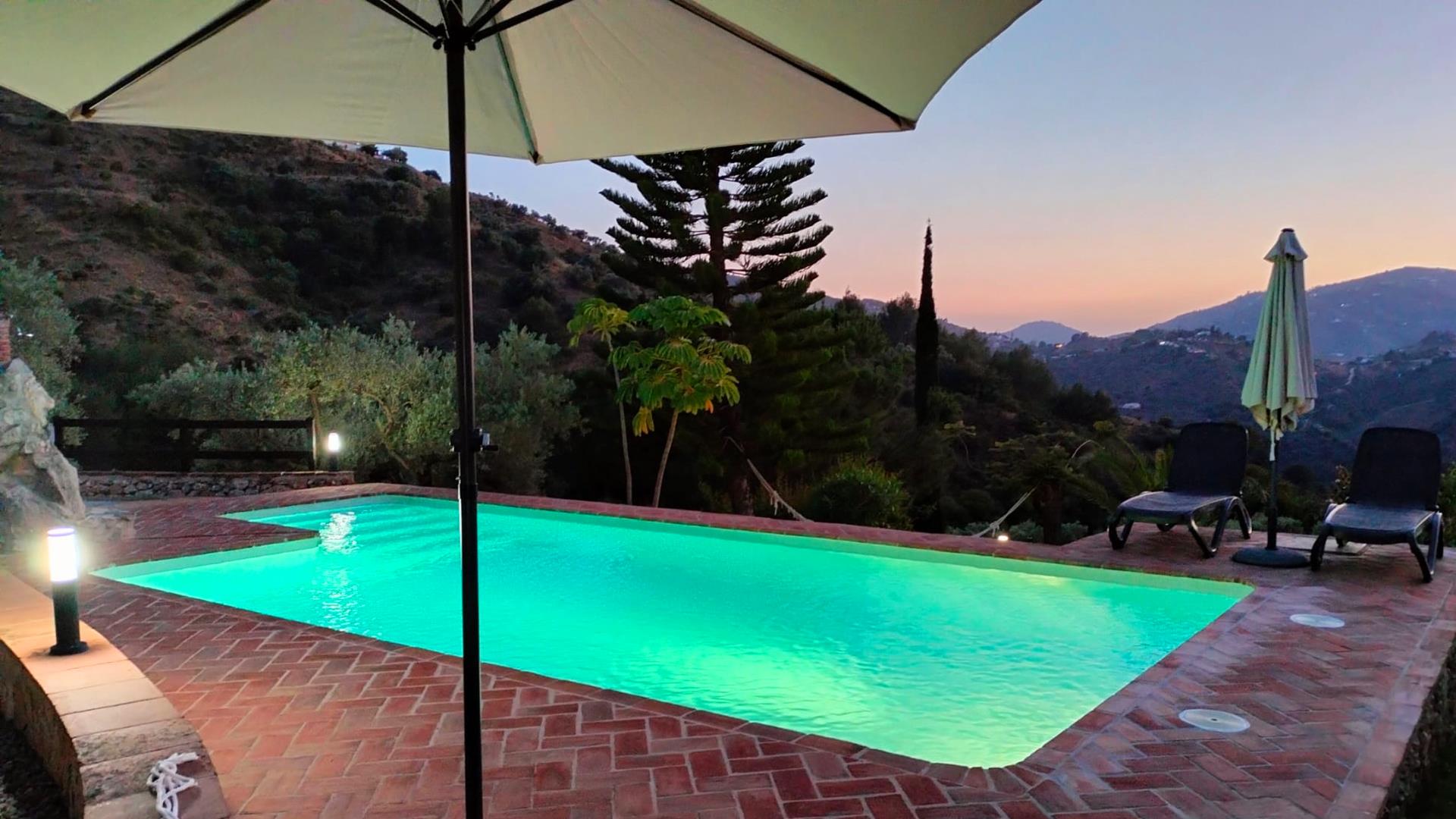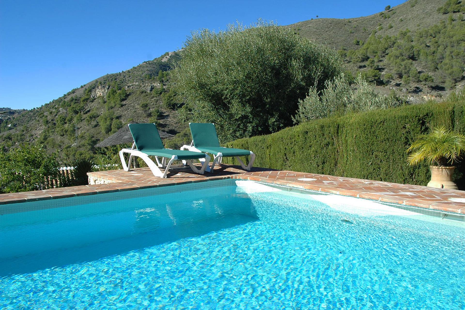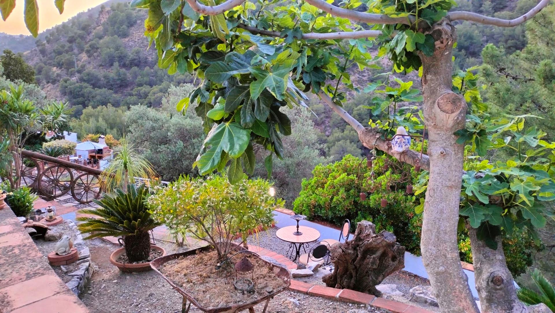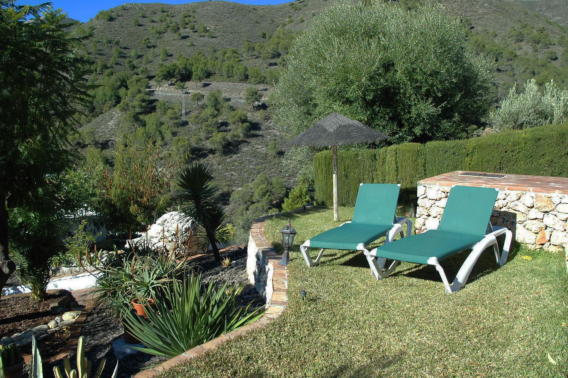 Rustiek, privé en landelijk. Dat is de essentie van deze heerlijke locatie. Na een mooie autorit door de bergen ontdekt u deze verborgen vallei, 10 minuten rijden van Frigiliana. De toegangsweg heeft een paar scherpe bochten, maar is volledig verhard en niet moeilijk om te rijden. De "cortijo" is omgeven door een grote tuin met verschillende zithoekjes met bloemen en bomen. Er is een aantrekkelijk barbecuegedeelte en een schaduwrijke veranda met meubilair. Het privé zwembad van 7 x 4 meter (met ligstoelen) ligt op een wat hoger niveau met panoramische uitzichten over het dal en over het 1 kilometer verderop gelegen buurtschap El Acebuchal, een klein dorpje met een interessante geschiedenis: nadat de inwoners in 1949 door het Franco regime waren verdreven bleef El Acebuchal lange tijd onbewoond en raakte in verval. Totdat in 1998 een nakomeling van een van de oorspronkelijke bewoners er een huis kocht en anderen aanmoedigde om de 32 huizen, het stadhuis, de kapel, de bars en de straten waaruit het dorp bestond te helpen opbouwen. Om het buurtschap weer terug te brengen in zijn oude glorie werd de renovatie zeer zorgvuldig uitgevoerd, met oog voor detail. Geen winkels hier, maar wel een bar-restaurant dat regionale specialiteiten serveert, zoals wild zwijn en geitengerechten. In Frigiliana, een van de z.g. witte dorpen en een bezoek meer dan waard, vindt u een uitgebreid aanbod aan winkels, tapasbars en restaurants. Bezoek aan Nerja (9 kilometer) is eveneens de moeite waard: u kunt er genieten van de mooiste stranden en een duikje nemen in de Middellandse zee.