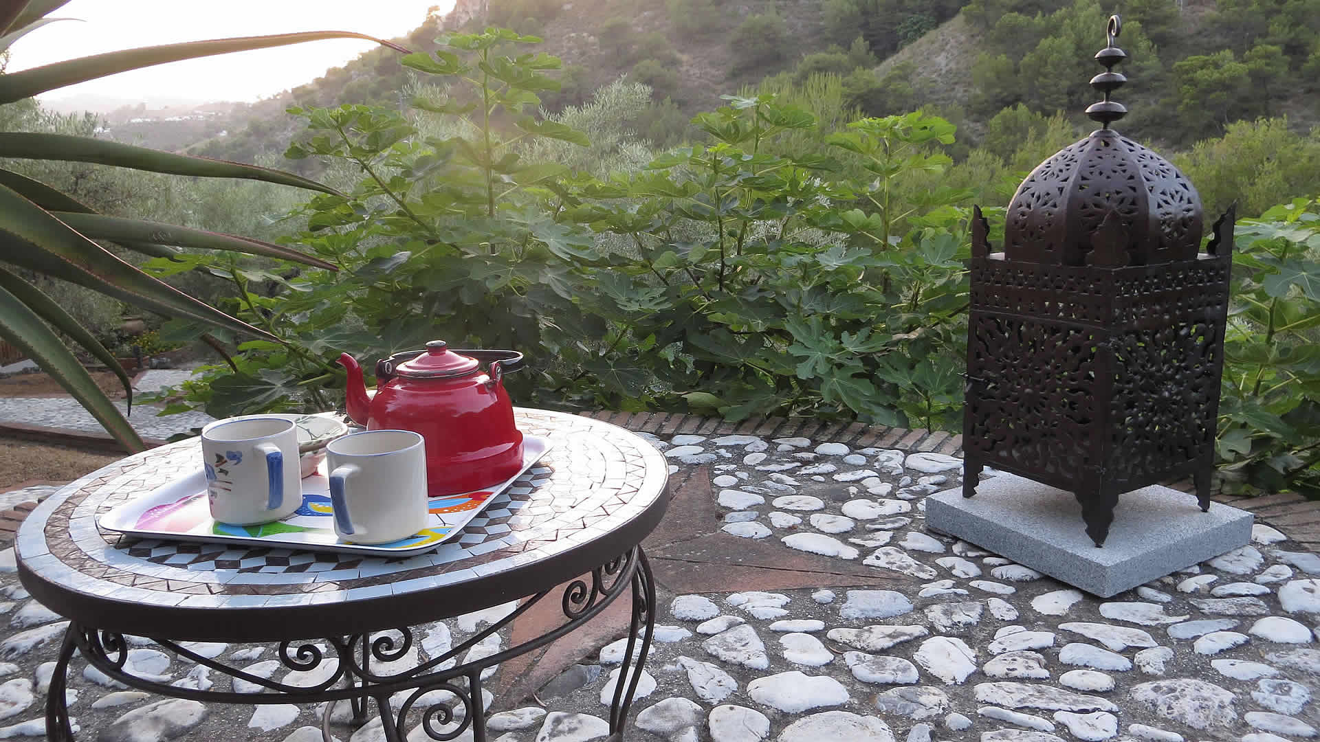 Toen Damian, de eigenaar van het huis, ons benaderde met de vraag of we zijn "cottage" wilden promoten, vertelde hij ons in eerste instantie niets over de naam. In plaats daarvan stuurde hij ons een aantal foto's die ons wel aanspraken en we besloten in de herfst van 2009 een kijkje te nemen. Damian pikte ons die dag op in het dorp Frigiliana en trakteerde ons op een mooie autorit van 10 minuten door de bergen. Hoewel de weg naar het huis weliswaar enkele scherpe bochten heeft zijn er geen problemen omdat het pad volledig is verhard. Bij aankomst waren we zeer onder de indruk van de uitzonderlijk mooie ligging van dit huis: verborgen in één van de allermooiste dalen die deze streek rijk is en die grenst aan het Nationaalpark Sierra Tejada. Ofschoon het lijkt alsof je hier mijlenver verwijderd bent van de zee liggen de stranden van Nerja maar 20 minuten rijden hiervandaan (9 kilometer). Met het vaste voornemen om respectvol om te gaan met de omringende natuur, zo vertelde Damian, wilden hij en zijn vrouw dat het huis geen inbreuk zou maken op de bestaande leefomgeving. Dat is zeker gelukt: het huis is omringd door dennenbomen, geurende planten en eeuwenoude, ecologisch gecultiveerde olijfbomen. Met het verrukkelijke dal op de achtergrond als decor vonden we een privé zwembad van 9 x 4 meter omringd door een charmant terras met elegant tuinmeubilair. Omgeven door bomen maakt het geheel een zeer mediterrane indruk. Vanaf de zitkamer openen de tuindeuren naar het "groene betegelde terras", een heerlijke plek voor uw ontbijt en diner, ondertussen wegdromend bij de magnifieke uitzichten over het omringende landschap. De kleurige Marokkaanse tafel bij de ingang van het huis bepaalt direct de ontspannen atmosfeer en hier komt de naam van het huis tevoorschijn: desgevraagd vertelt Damian ons het volgende: "Als je in staat bent om het geschenk van de natuur naar waarde te schatten en ze als momenten van geluk kunt ervaren, dan heb je de "Kleuren in de Wind" gezien".