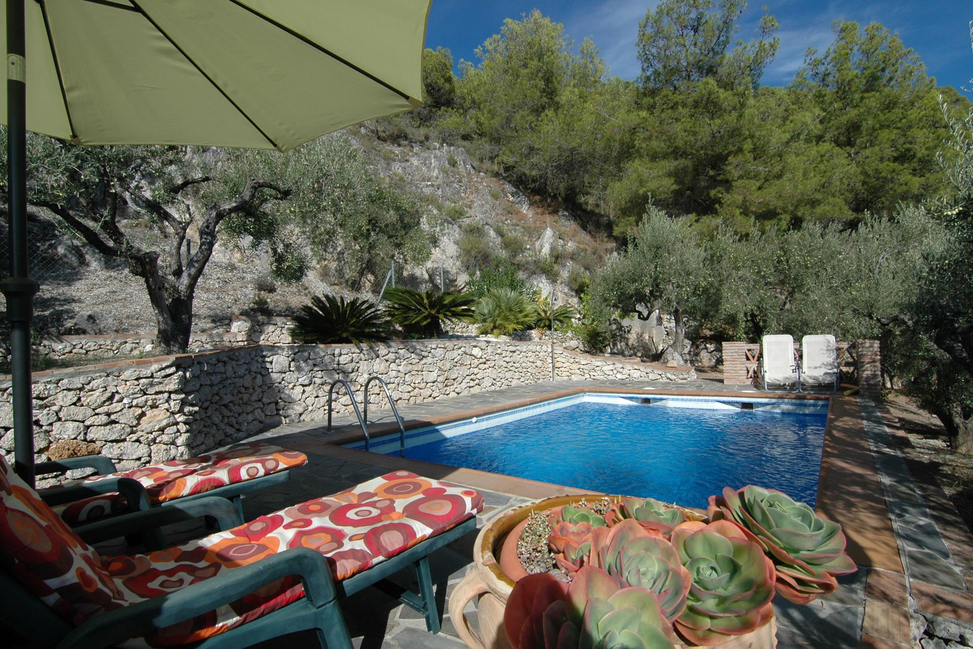 Dit casita is landelijk gelegen in een schitterende omgeving iets ten noordwesten van Frigiliana. Het is gebouwd net vóór 1999; in dat jaar werd het gebied onderdeel van het natuurpark van de Sierra de Tejeda en Almijara. Als u van wandelen en trekken houdt valt er in dit gebied heel wat te ontdekken! Blijft u liever thuis dan geniet u vast en zeker van de heerlijke tuin die prachtig is geïntegreerd in het omliggende landschap en volledige privacy biedt door de omringende olijf-en pijnbomen. Het privé zwembad (6 meter lang, 4 tot 5 meter breed; 1,40 tot 1,80 meter diep) ligt te midden van een zonnig terras met ligstoelen; het naastgelegen barbecuegedeelte wordt vast en zeker uw favoriete plek om buiten te eten! Het huisje zelf beschikt over een ruime veranda met patiomeubilair en met natuurlijk het fantastische panoramische uitzicht waar wij het eerder al over hadden. Om te winkelen en buiten de deur te eten vindt u, op slechts 5 minuten rijden, in het witte dorp Frigiliana een uitgebreid aanbod aan mogelijkheden. Prachtige witte zandstranden en watersportmogelijkheden vindt u in Nerja, 10 minuten rijden.