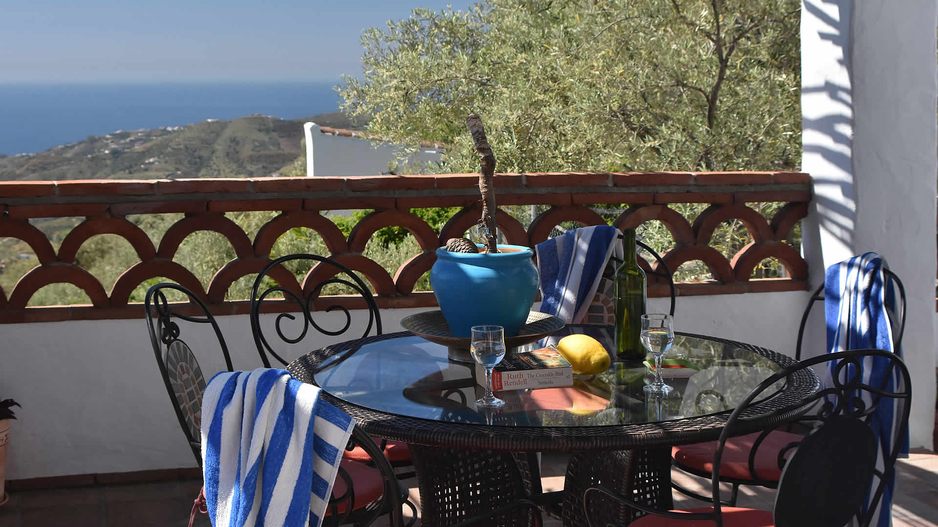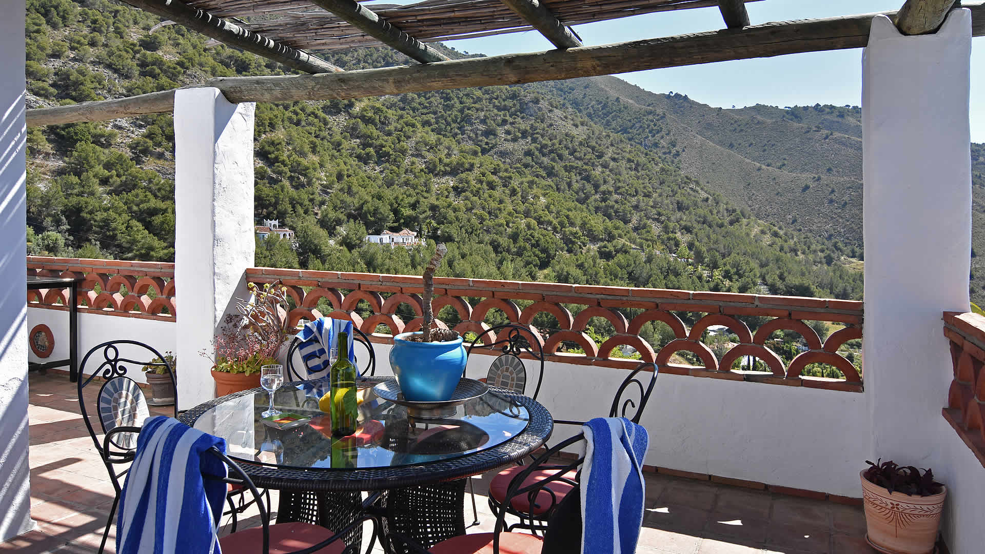 Dit landhuis ligt in de bergen, 3,5 kilometer ten Noorden van Frigiliana. Vanaf uw plekje bij het zwembad zult u versteld staan van de meest verbluffende panoramische uitzichten over de bergen, het dorp Frigiliana en de stad Nerja met in de verte de Middellandse Zee. Buiten hebben de eigenaren ook met veel zorg een sfeer gecreëerd die in harmonie is met de prachtige omgeving; een combinatie van olijfbomen met natuursteen en handgemaakte stenen. Hier vindt u alles wat u nodig heeft voor een perfecte vakantie: een privé zwembad van 7x4 meter en 1–1.6 meter diep, een zonneterras met ligstoelen, een barbecue en comfortabel patiomeubilair om lekker buiten te eten. Via een slingerende, volledig met asfalt en beton verharde weg door de bergen bereikt u deze mooie finca. Hoewel de ervaring heeft geleerd dat gasten er snel aan wennen, kan het laatste smalle deel (ca.60 meter) van de weg lastig zijn voor mensen met een wat nerveuzere aard.