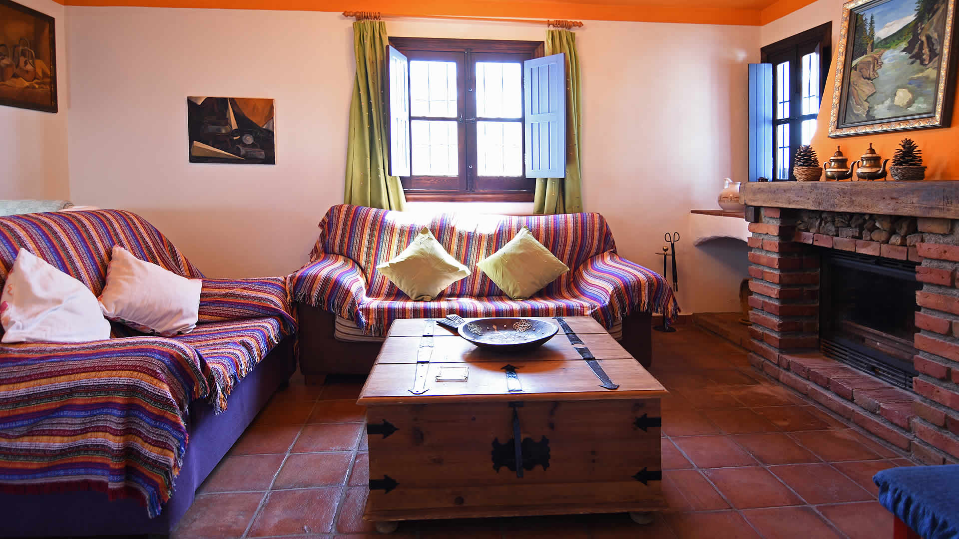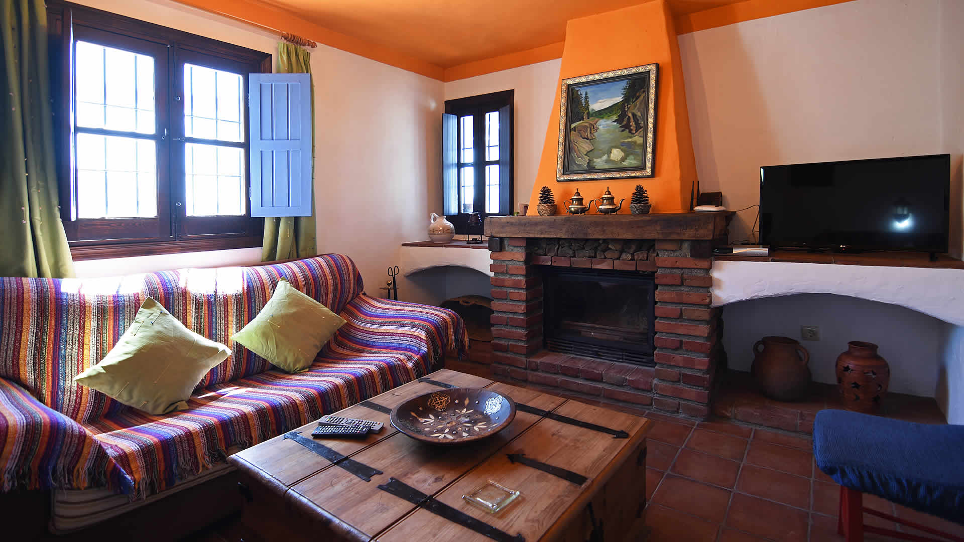 Dezelfde zorg waarmee Jose Manuel en Pilar de buitenruimtes omgeven zien we ook binnen: het huis is ingericht in harmonie met de authentieke Andalusische traditie, het meubilair met liefde voor de lokale stijl uitgekozen. Er is een ruime eetkamer/keuken met toegang tot de zitkamer met twee banken, een open haard en satelliettelevisie. De open keuken heeft prachtige originele tegels die langs de randen zijn afgewerkt met kiezelsteen en in weerwil van de ouderwetse koperen kraan is de keuken voorzien van alle moderne comfort zoals een 4-pits keramische kookplaat, een magnetron, koelkast/vriezer en een vaatwasser. De wasmachine vindt u naast het barbecuegedeelte buiten. Boven bevinden zich twee romantische slaapkamers (een kamer met een tweepersoonsbed en een kamer met twee aparte bedden) met houten balkenplafonds en een complete doucheruimte. De derde slaapkamer in het souterrain verdient extra aandacht voor haar design: het hoofdbord achter de twee apart van elkaar staande bedden bestaat geheel uit kiezelstenen, een minutieus en tijdrovend handwerk van Jose Manuel zelf! Deze slaapkamer heeft een eigen doucheruimte met wastafel en toilet.