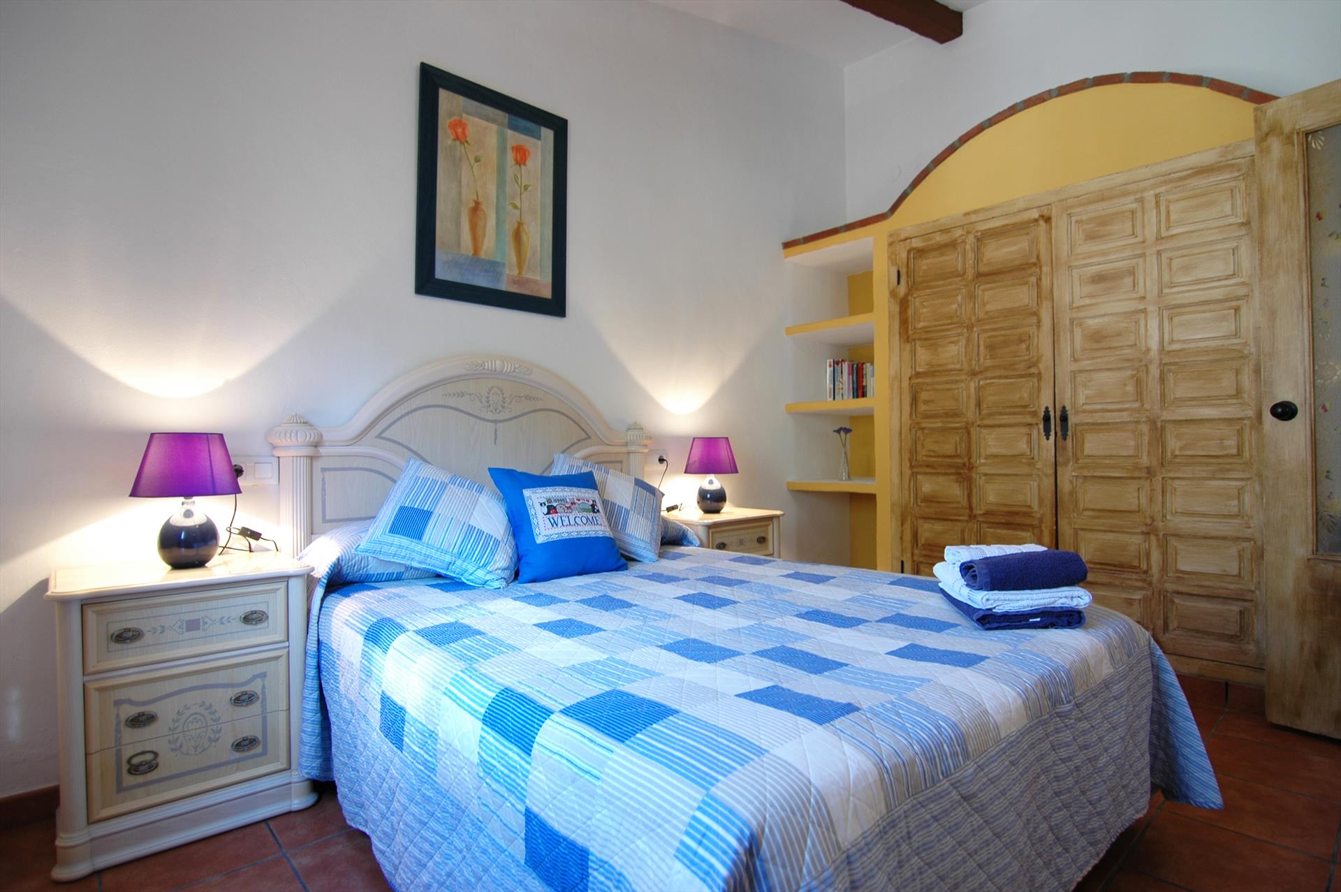 Het huisje is ingericht in de typisch rustieke stijl van Andalusië met blauw/witte tinten. Het is praktisch ingedeeld met een knusse open zitkamer met aangrenzend de eethoek en de keuken. Het woongedeelte is voorzien van een bankstel voor 4 personen, een houtkachel en satelliettelevisie met dvd-speler. De keuken is functioneel ingericht met een 4-persoons eettafel, een keramische kookplaat, een koelkast/vriezer, magnetron, een vaatwasser, een kleine elektrische oven en alle gebruikelijke keukenbenodigdheden. De wasmachine staat in de bijkeuken. U vindt in dit intieme cortijo twee slaapkamers: een kamer met een tweepersoonsbed en een kamer met twee aparte bedden. De gezamenlijke doucheruimte is voorzien van een wastafel en toilet.