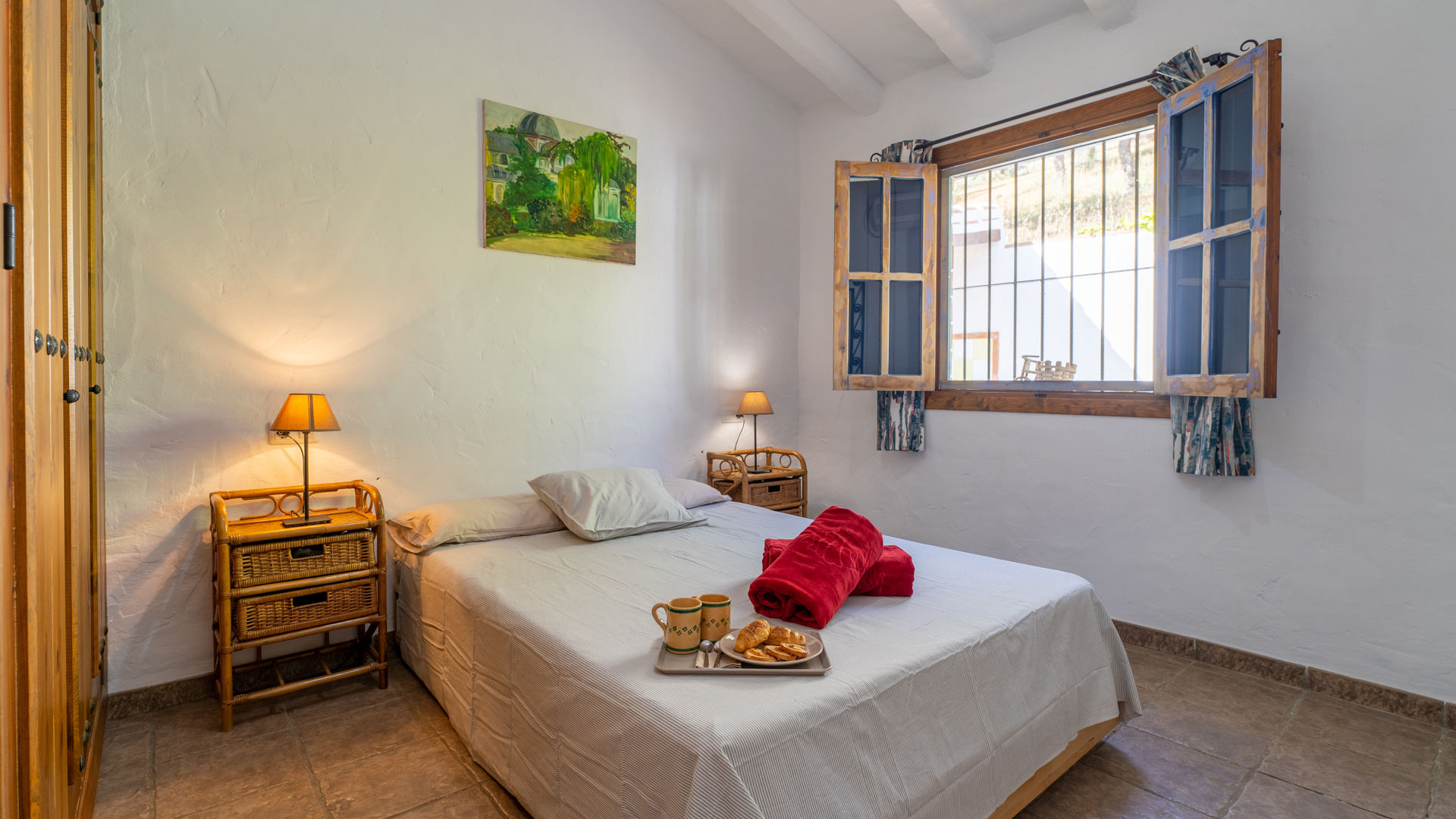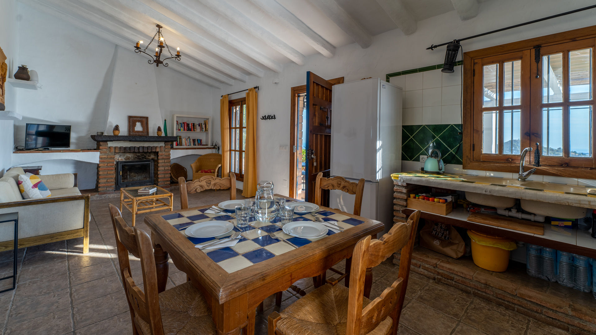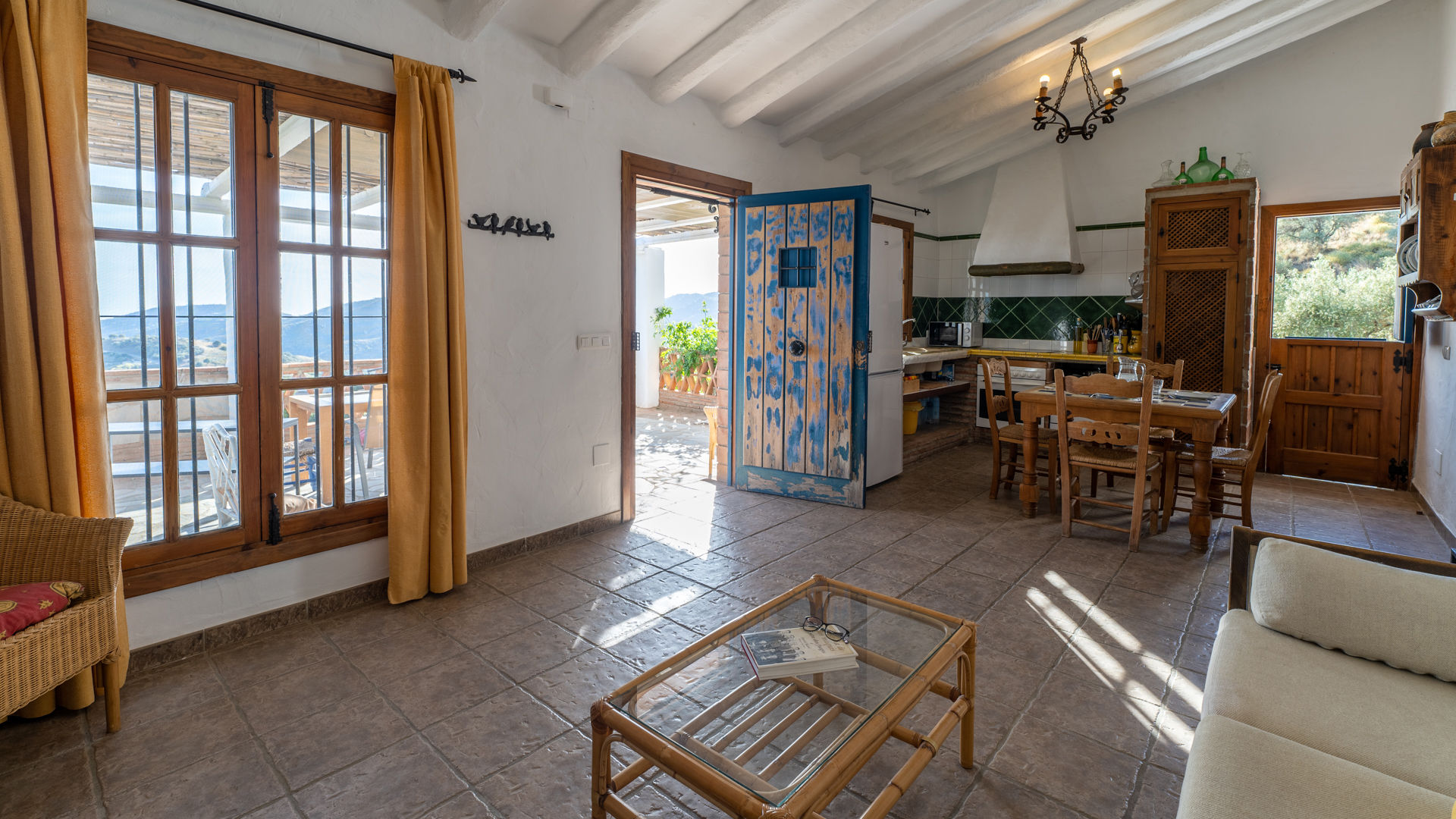 In het huisje is een rustige en romantische atmosfeer gecreëerd door middel van een authentieke Andalusische inrichting met elementen als balkenplafonds, traditionele stenen, ambachtelijke handgemaakte tegels en de wit met okergekleurde muren. De zitkamer is samen met de eethoek en de keuken tot één geheel gemaakt. U vindt er twee banken, een houtkachel, een radio/cassette/cd-speler en satelliettelevisie. De volledig uitgeruste keuken heeft een 4-pits keramische kookplaat, een elektrische oven, koelkast/vriezer, magnetron en een wasmachine. Er zijn 2 slaapkamers: een kamer met een tweepersoonsbed en een kamer met twee aparte bedden. Beide kamers hebben de originele okerkleurige plafonds die mooi contrasteren met de witte muren. De gedeelde badkamer bevindt zich tussen de twee slaapkamers en heeft een douche boven het bad, een wastafel en een toilet.