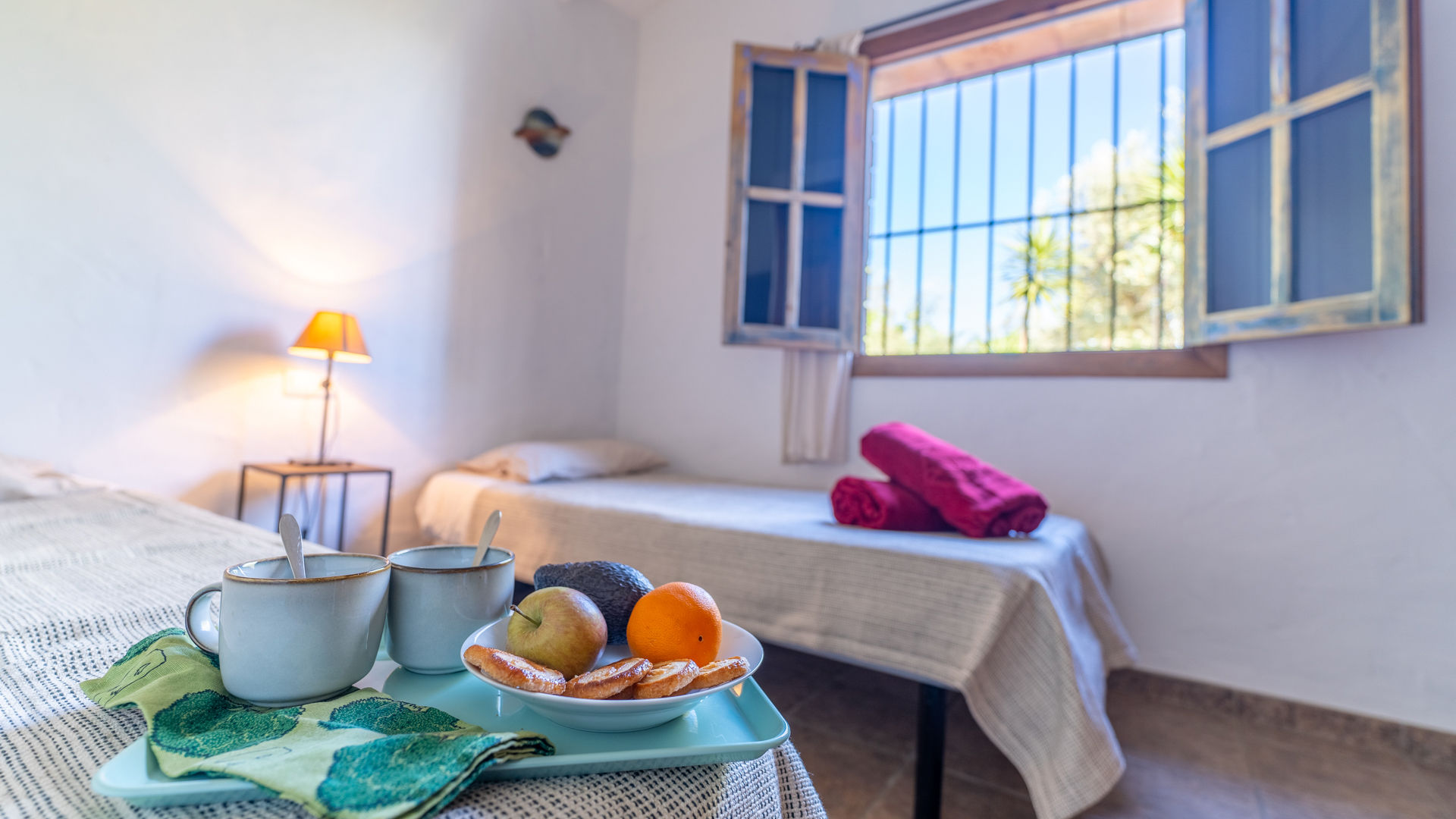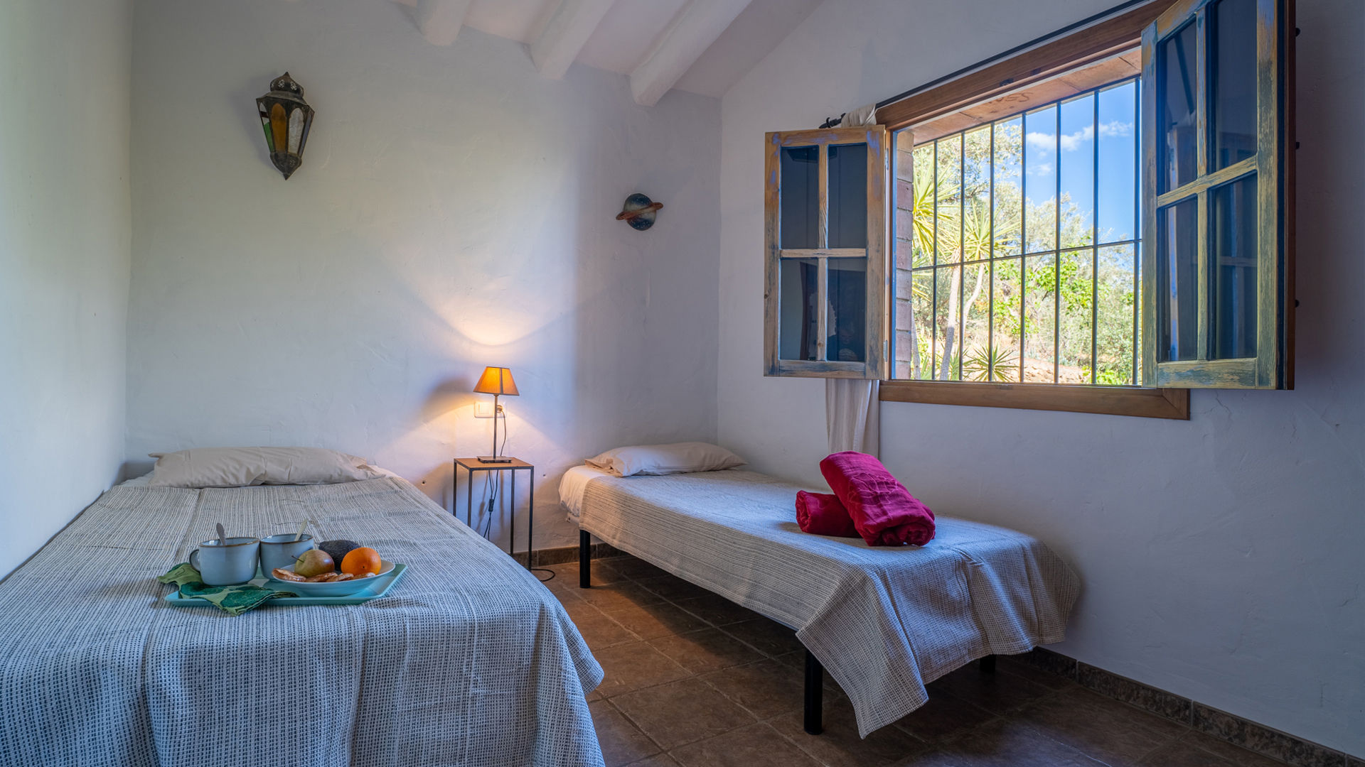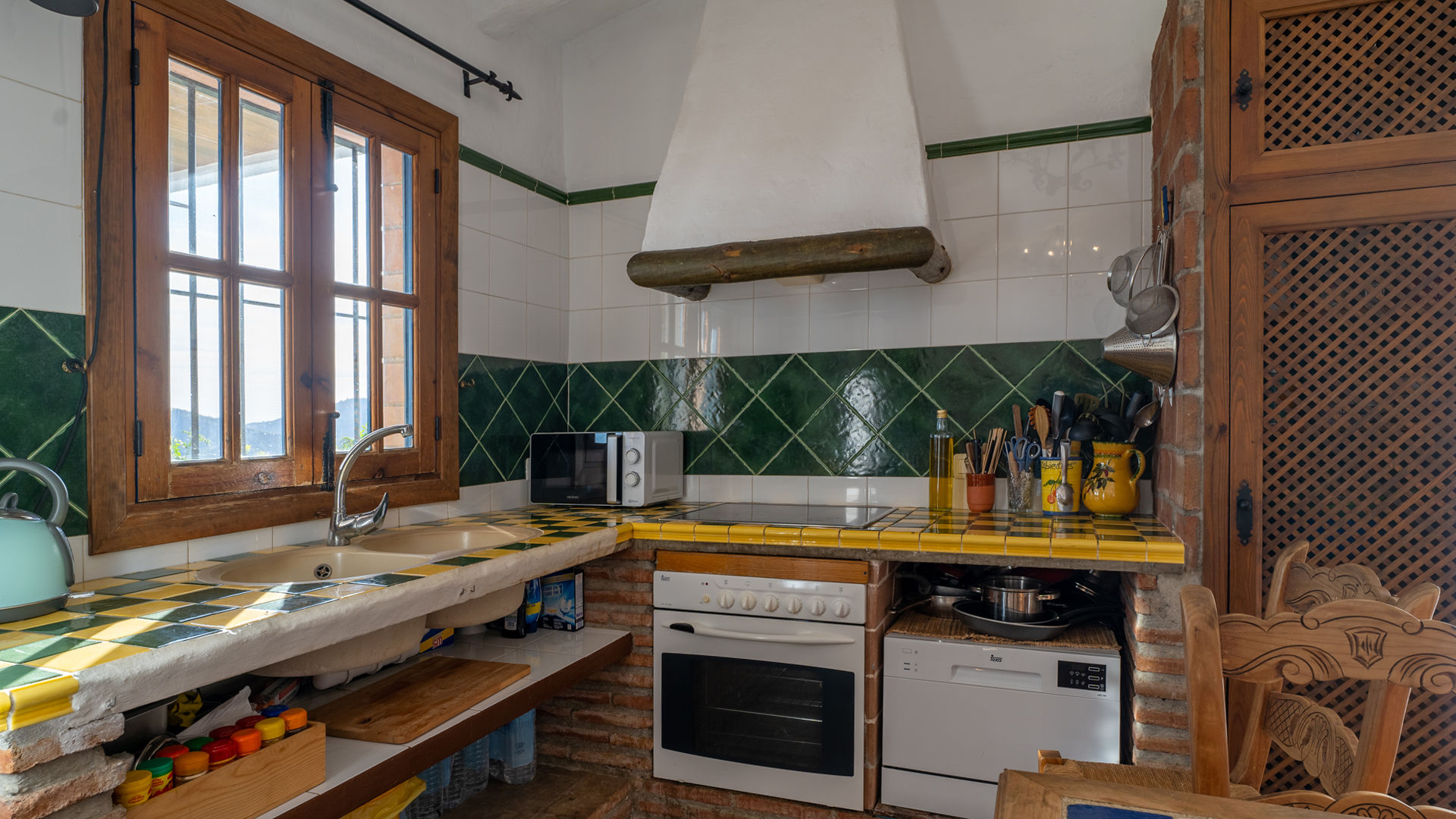 In het huisje is een rustige en romantische atmosfeer gecreëerd door middel van een authentieke Andalusische inrichting met elementen als balkenplafonds, traditionele stenen, ambachtelijke handgemaakte tegels en de wit met okergekleurde muren. De zitkamer is samen met de eethoek en de keuken tot één geheel gemaakt. U vindt er twee banken, een houtkachel, een radio/cassette/cd-speler en satelliettelevisie. De volledig uitgeruste keuken heeft een 4-pits keramische kookplaat, een elektrische oven, koelkast/vriezer, magnetron en een wasmachine. Er zijn 2 slaapkamers: een kamer met een tweepersoonsbed en een kamer met twee aparte bedden. Beide kamers hebben de originele okerkleurige plafonds die mooi contrasteren met de witte muren. De gedeelde badkamer bevindt zich tussen de twee slaapkamers en heeft een douche boven het bad, een wastafel en een toilet.