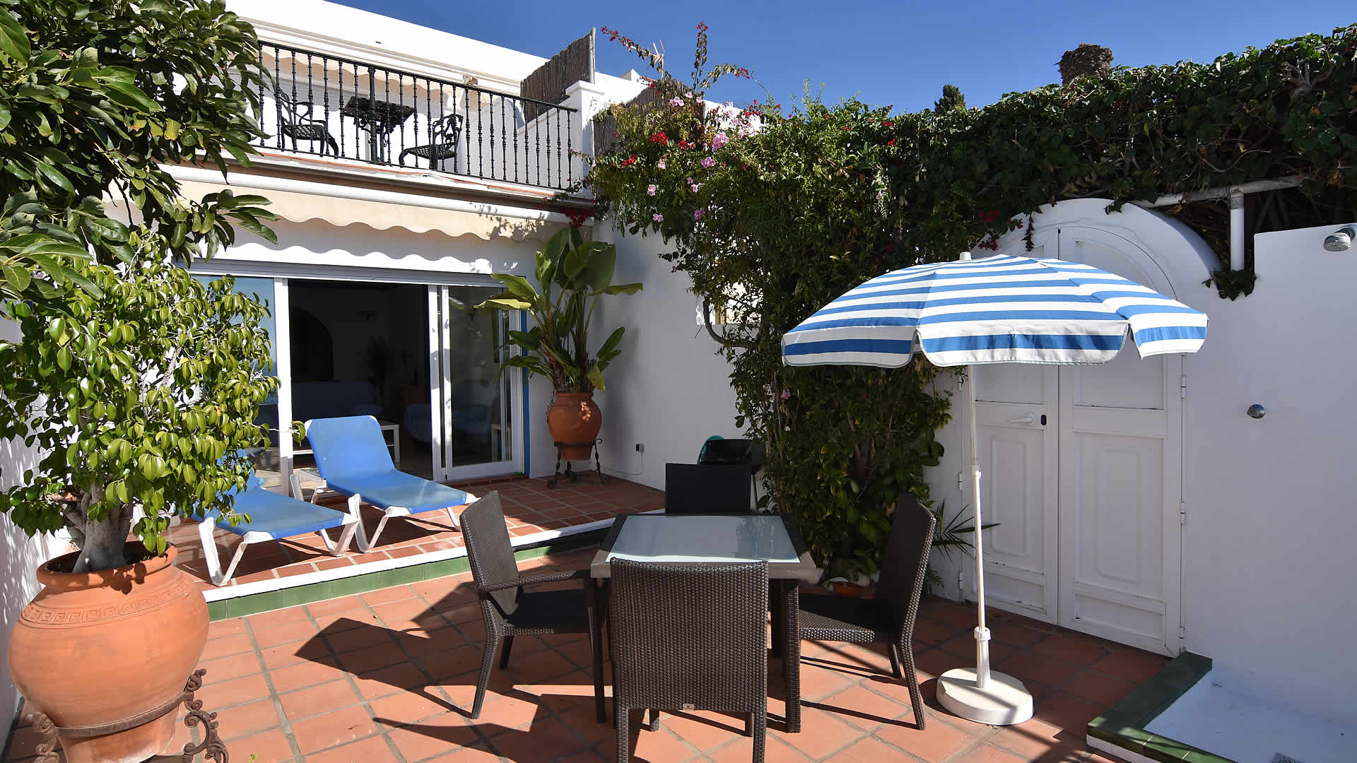 Een huurauto heeft u hier niet nodig, het is maar een paar minuten lopen naar Nerja's stranden: playa Carabeillo en playa Carabeo. Los daarvan, in het centrum van de stad zijn vele tapasbars, restaurants en winkels, op enkele minuten loopafstand. Wilt u de schitterende Andalusische steden bezoeken, dan neemt u gewoon het openbaar vervoer vanaf het busstation in de Avenida de Pescia (800 meter) of een excursie onder leiding van een gids. Het huis beschikt over een groot terras met ligstoelen en privé zwembad (2,5m x 3,5m). Een grote zonneluifel zorgt voor een aangename plek om buiten te eten, tuinmeubilair en een barbecue zijn aanwezig. Voor families met kinderen is het goed om te weten dat er ook een gemeenschappelijk zwembad aanwezig is, zichtbaar op één van de foto's, waar meestal wel vriendjes en vriendinnetjes te vinden zijn. Op de 1e etage van het huis is een tweede terras met hetzelfde mooie uitzicht - dit terras is uitsluitend toegankelijk via de hoofdslaapkamer.