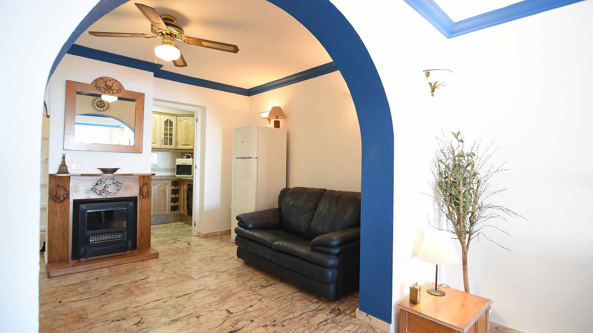 Het huis ligt verdeeld over twee verdiepingen en is comfortabel ingericht met marmeren vloeren. Op de begane grond vindt u de woonkamer met grote lcd-TV, eetgelegenheid en een open haard. De keuken is klein maar efficient ingericht met een keramische kookplaat, een oven, magnetron, vaatwasser en koelkast/vriezer. De wasmachine vindt u in een ruimte onder de trap. Er is een wc met wasbak op de begane grond.