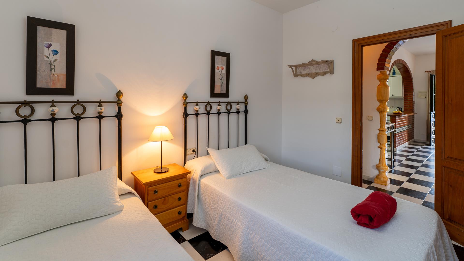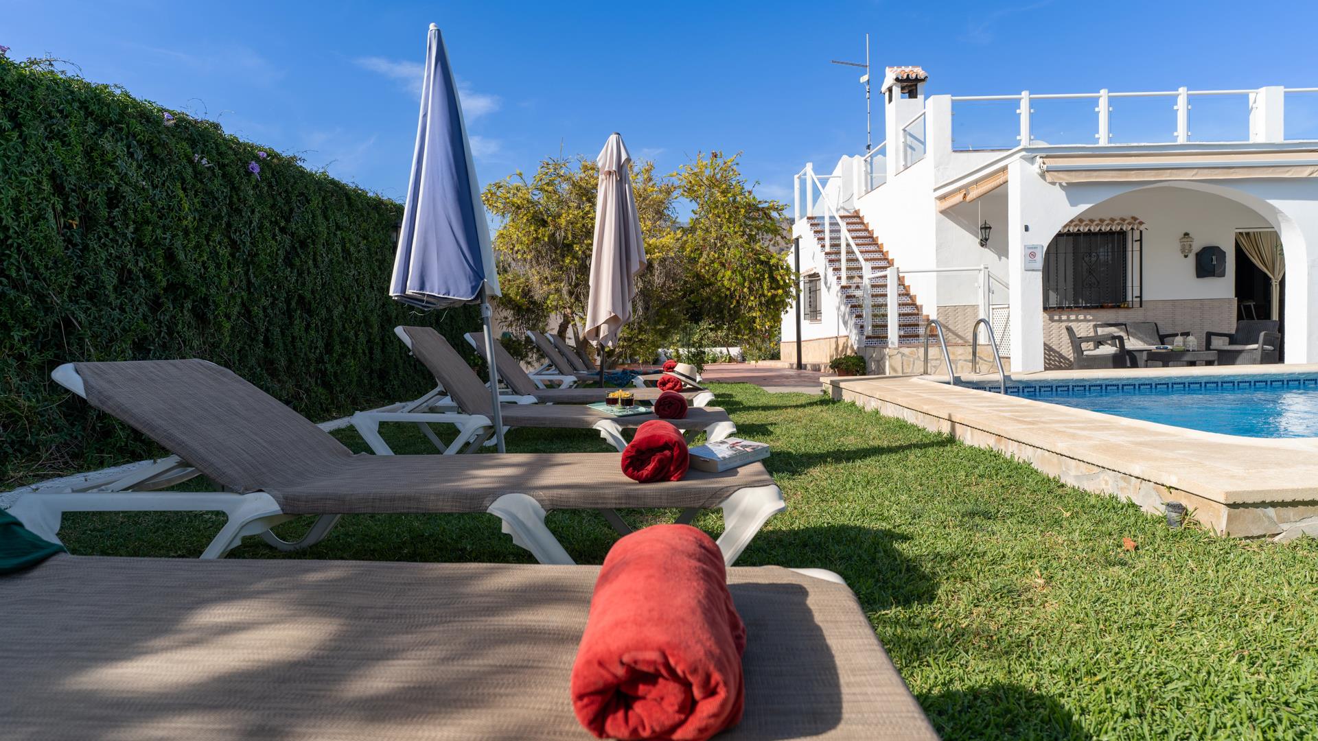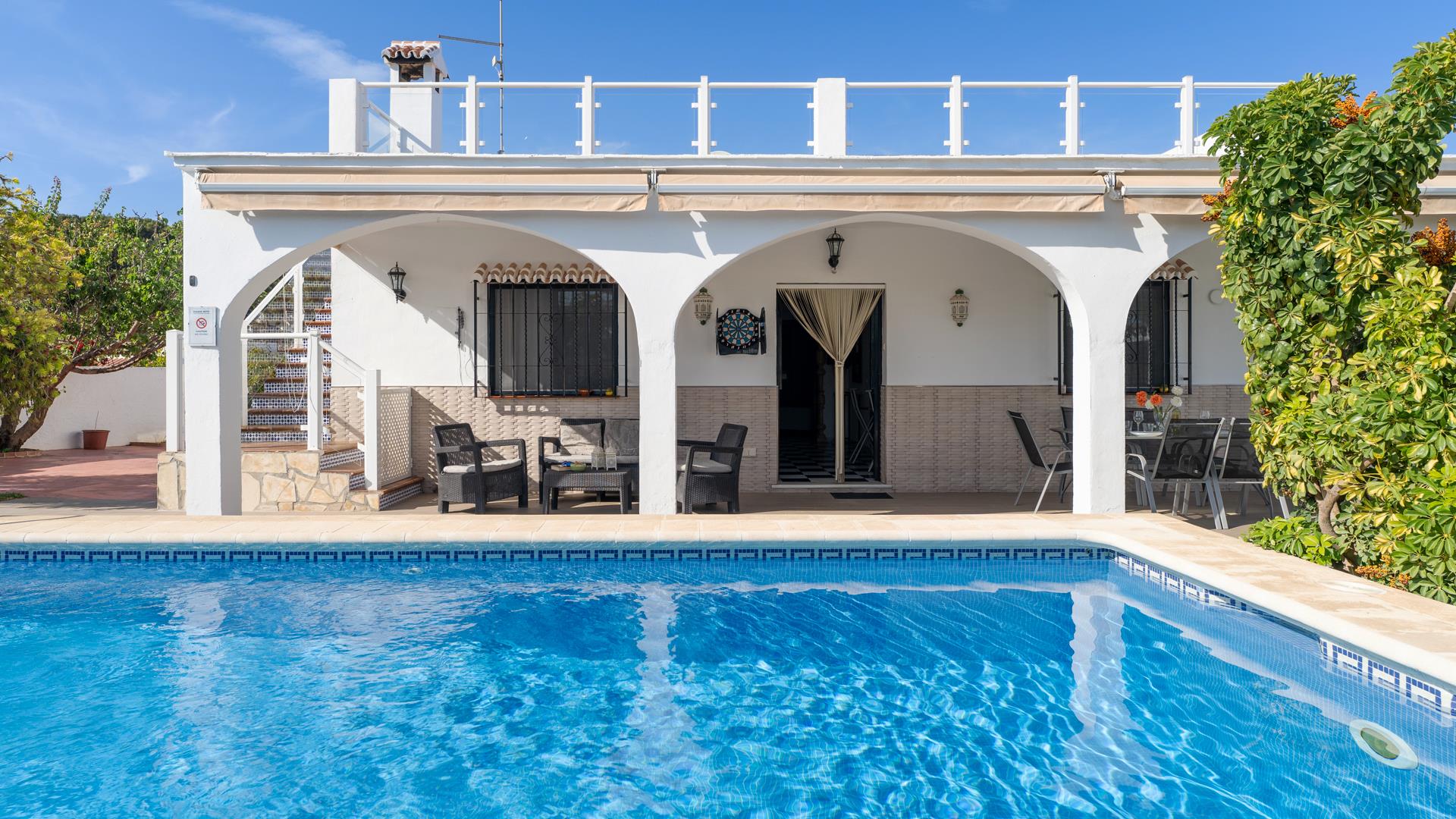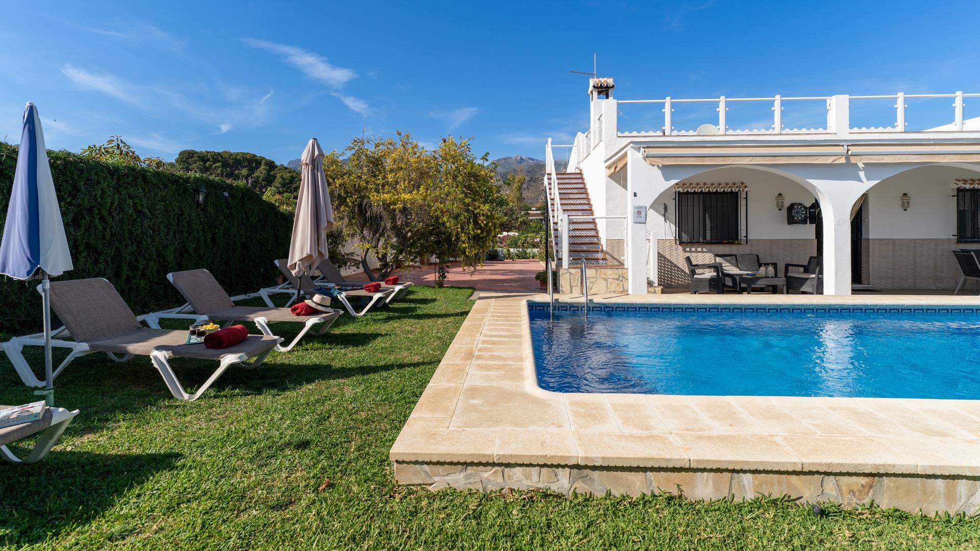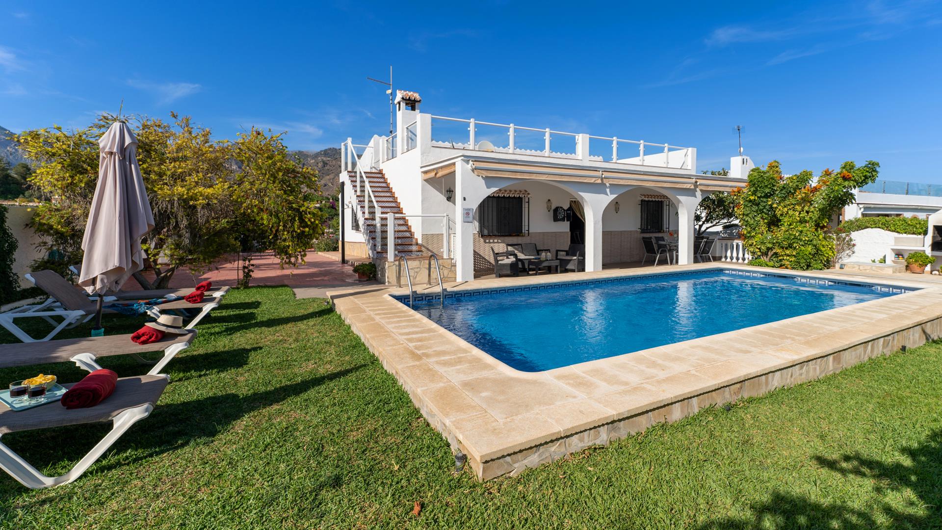 Bij deze semi landelijk gelegen villa op slechts 2 kilometer van Nerja kunt u genieten van inspirerende uitzichten over het landschap rondom en van de rustige omgeving; een aangenaam vooruitzicht voor een zorgeloze vakantie! Op een steenworp afstand vindt u een panificadora (broodfabriekje) en op 800 meter een Lidl supermarkt. De villa wordt omgeven door witte muren en door gazons die bijdragen aan een gevoel van privacy. Ze is toegankelijk via een parkeerplaats voor 2 auto’s en tevens via een aan de voorkant van het huis zichtbaar pad, dat door de tuin naar het zwembad loopt. Het privé zwembad van 7x4 meter heeft een iets verhoogde ligging en wordt afgegrensd door een goed geproportioneerd gazon, een ideale speelplek voor kinderen. Een mooi overwelfd terras loopt over de hele voorkant van de villa en de ingebouwde barbecue is handig als u buiten wilt eten. Op het grote dakterras met adembenemend uitzicht over het omliggende landschap is het heerlijk zonnebaden! Kortom: een kwalitatief uitstekende villa met een perfecte ligging om in alle rust bij te komen en toch gebruik te maken van de vele voorzieningen van het nabijgelegen Nerja.