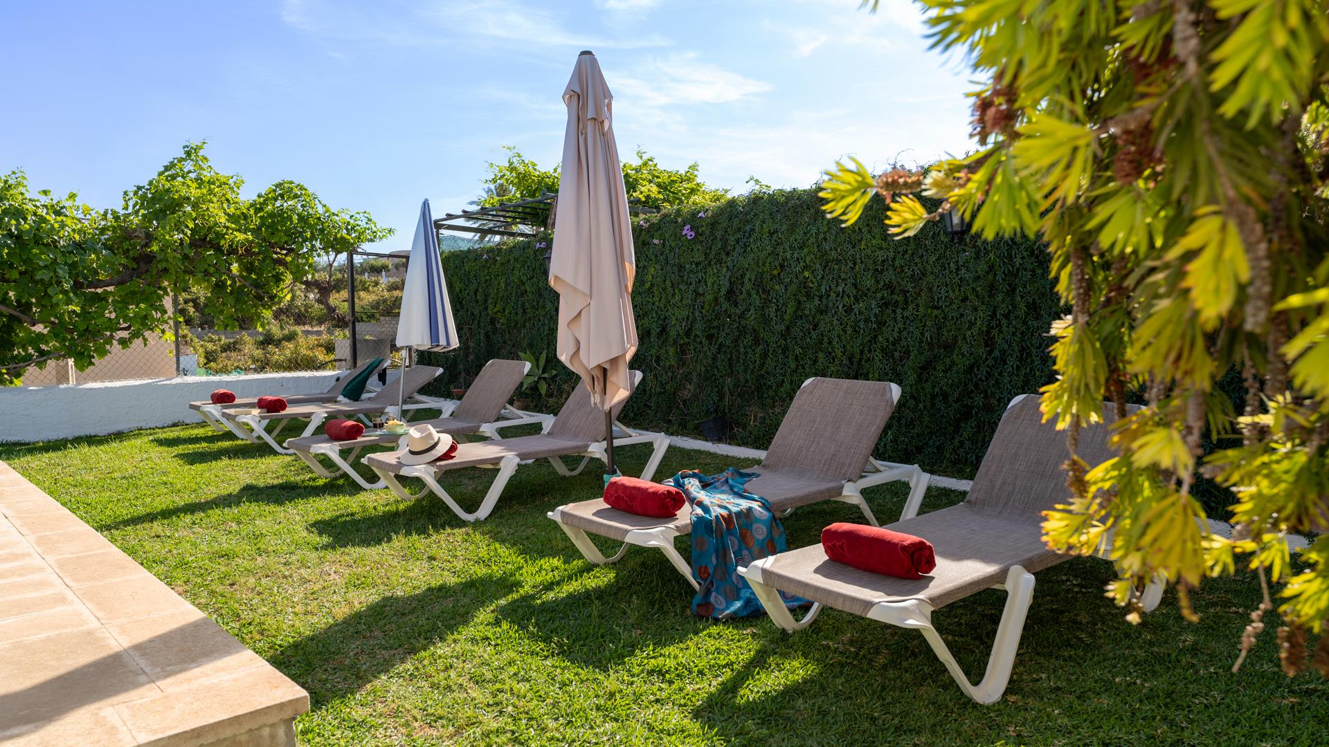 - mooie tuin met gazon en tuinmeubelen met ligstoelen