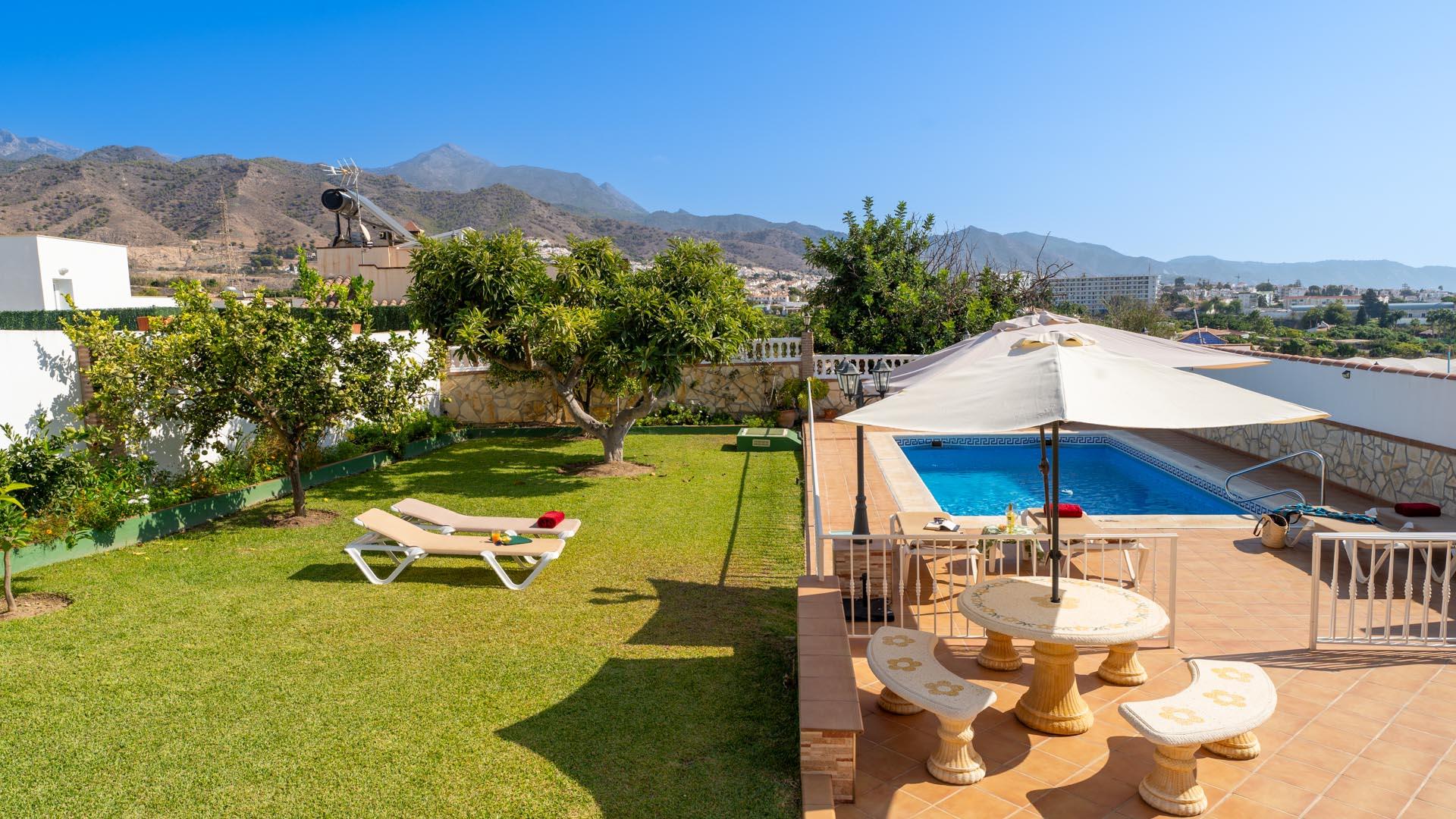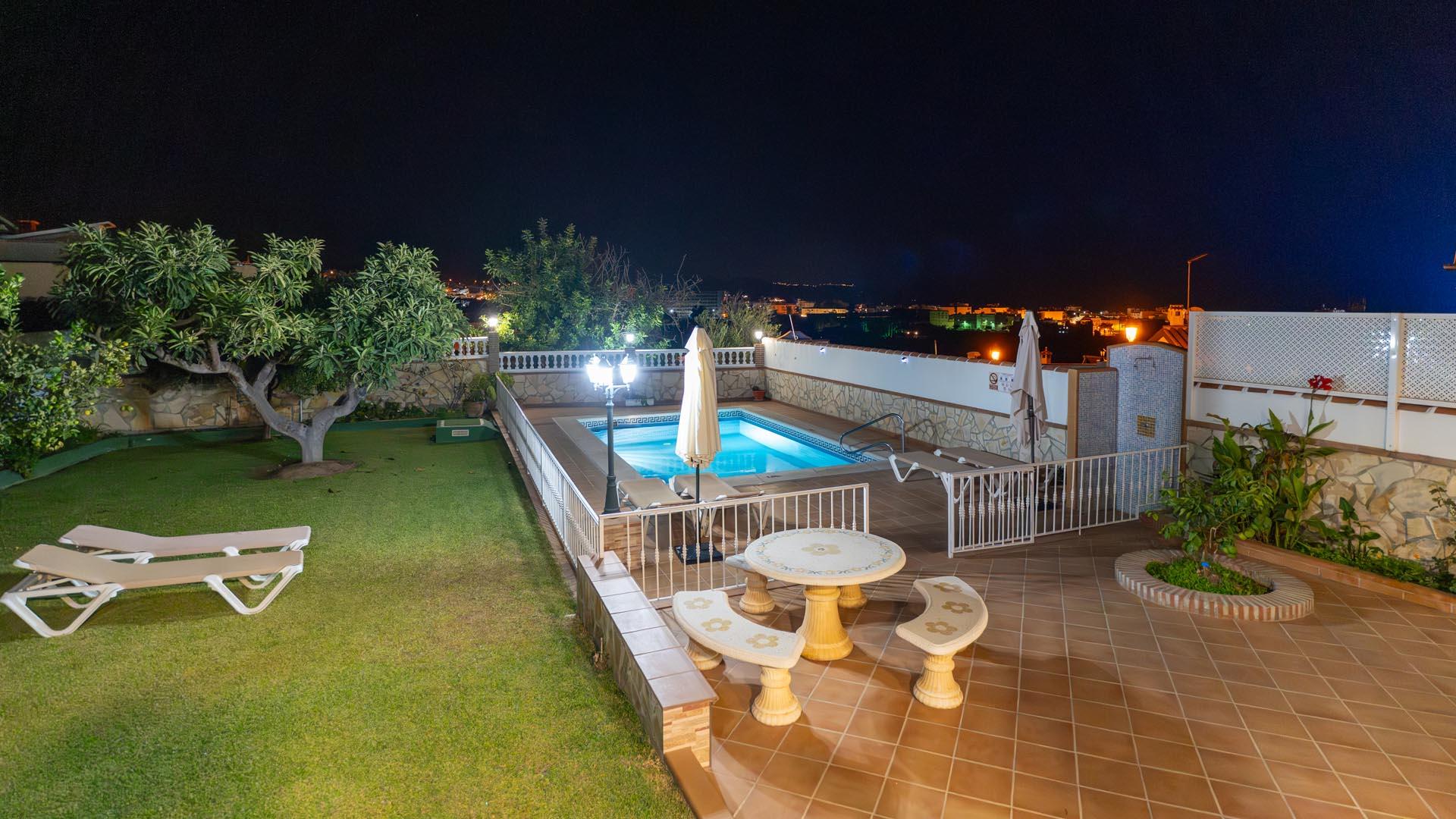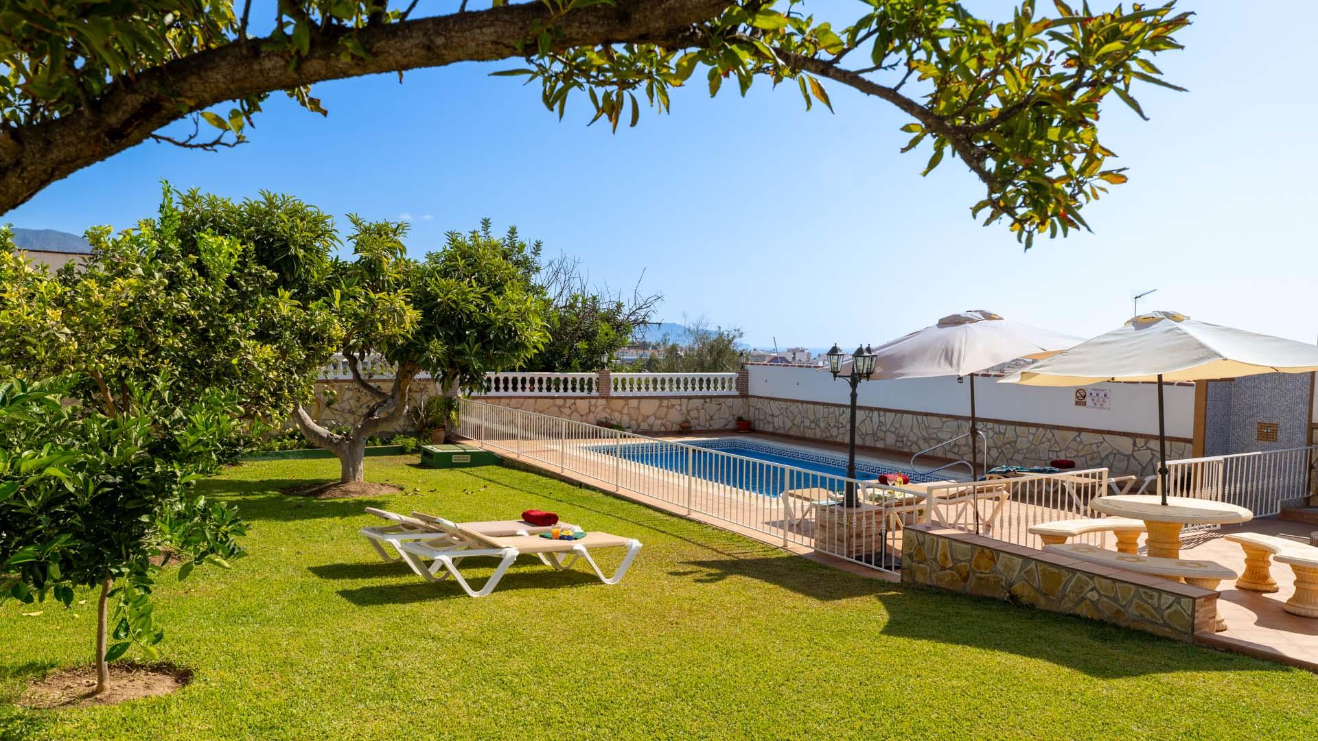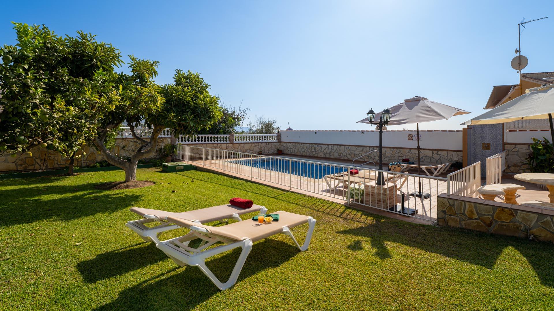 Dit vakantiehuis heeft aan de voorkant een mooie veranda vanwaar u uitkijkt over Nerja en de Middellandse Zee- een ideale plek om te genieten van uw ontbijt of diner. Een paar traptreden naar beneden leiden naar de grastuin en het privé zwembad (6,5m x 3,5m lang and 1.25m – 2.20m diep), met ligstoelen. Aangrenzend aan het huis vindt u een fijne zithoek met barbecue.