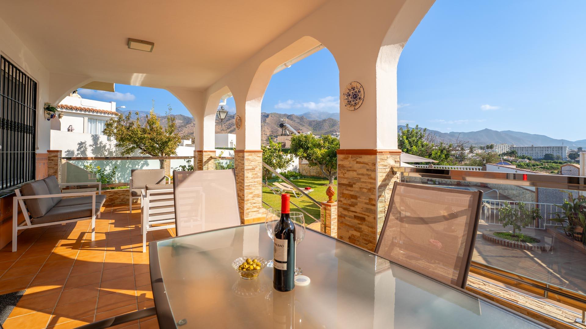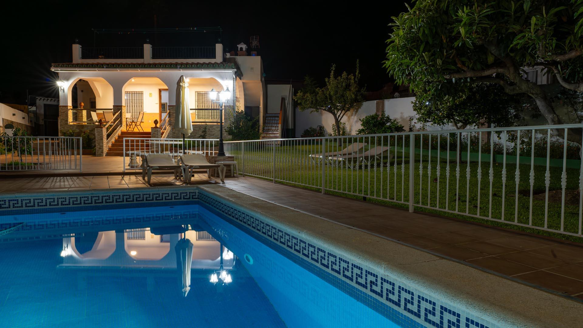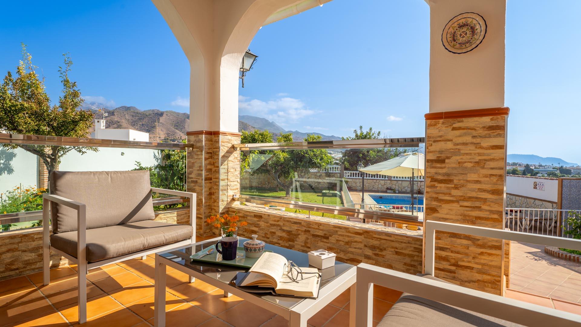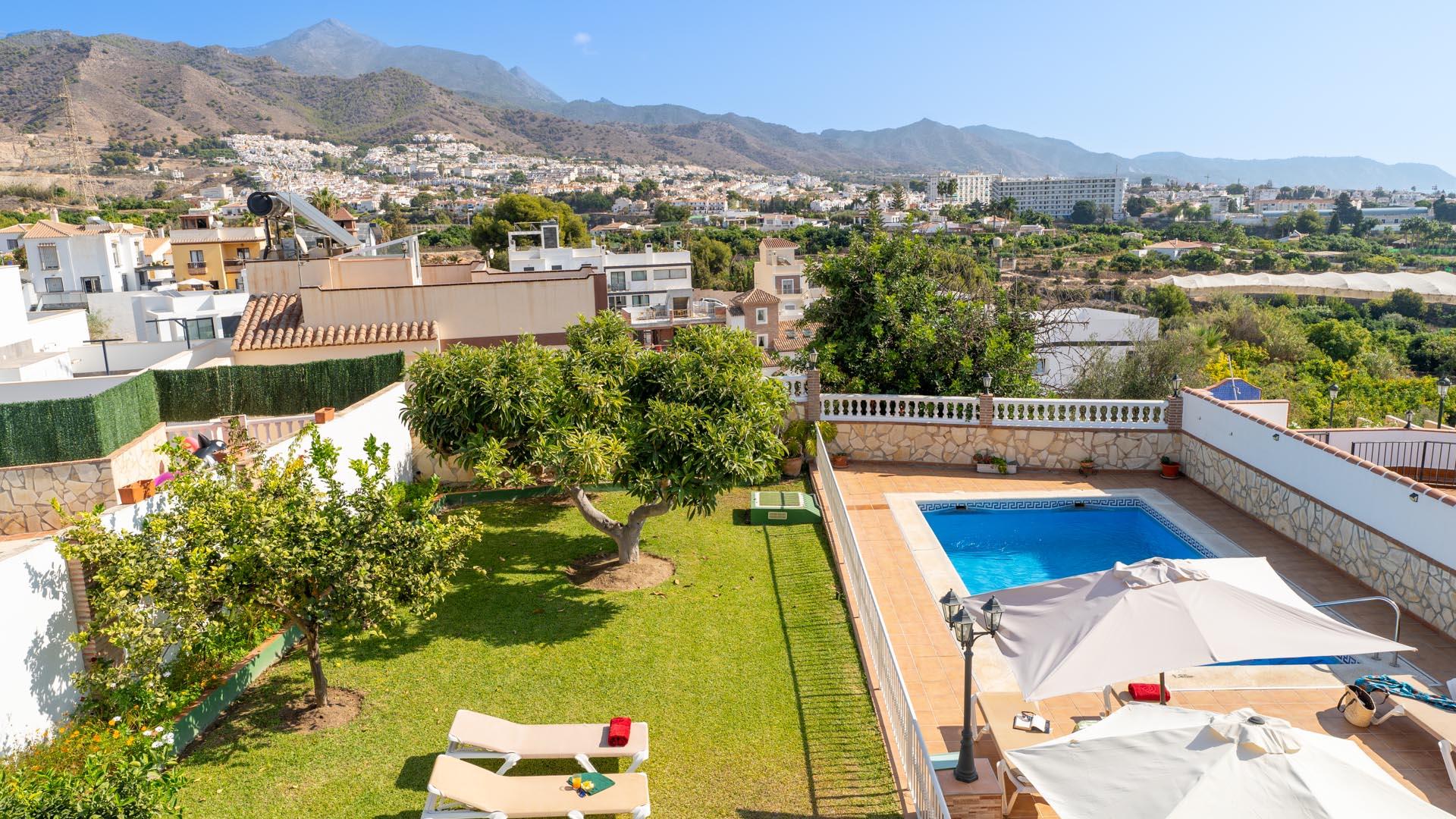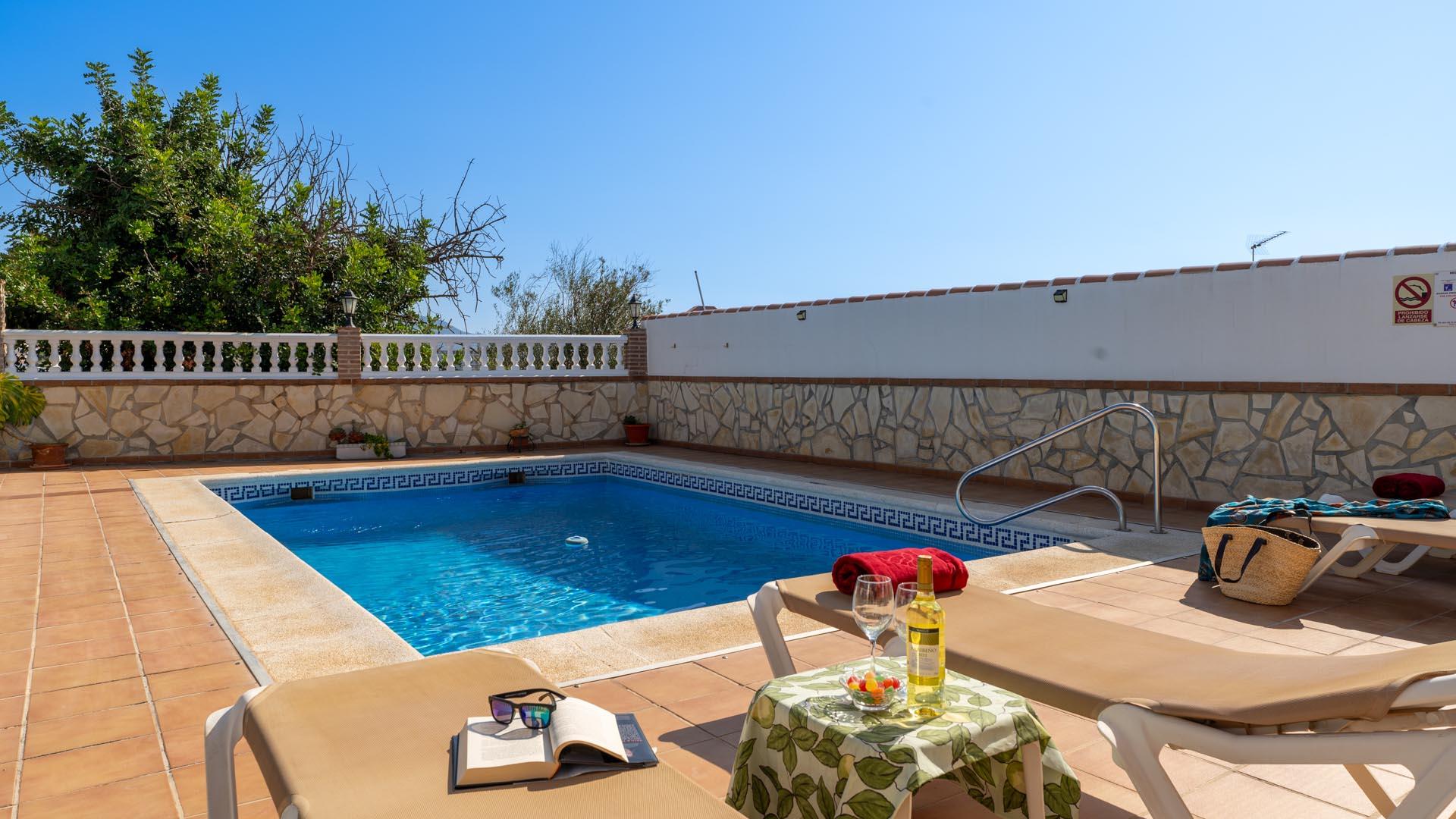 Dit vakantiehuis heeft aan de voorkant een mooie veranda vanwaar u uitkijkt over Nerja en de Middellandse Zee- een ideale plek om te genieten van uw ontbijt of diner. Een paar traptreden naar beneden leiden naar de grastuin en het privé zwembad (6,5m x 3,5m lang and 1.25m – 2.20m diep), met ligstoelen. Aangrenzend aan het huis vindt u een fijne zithoek met barbecue.