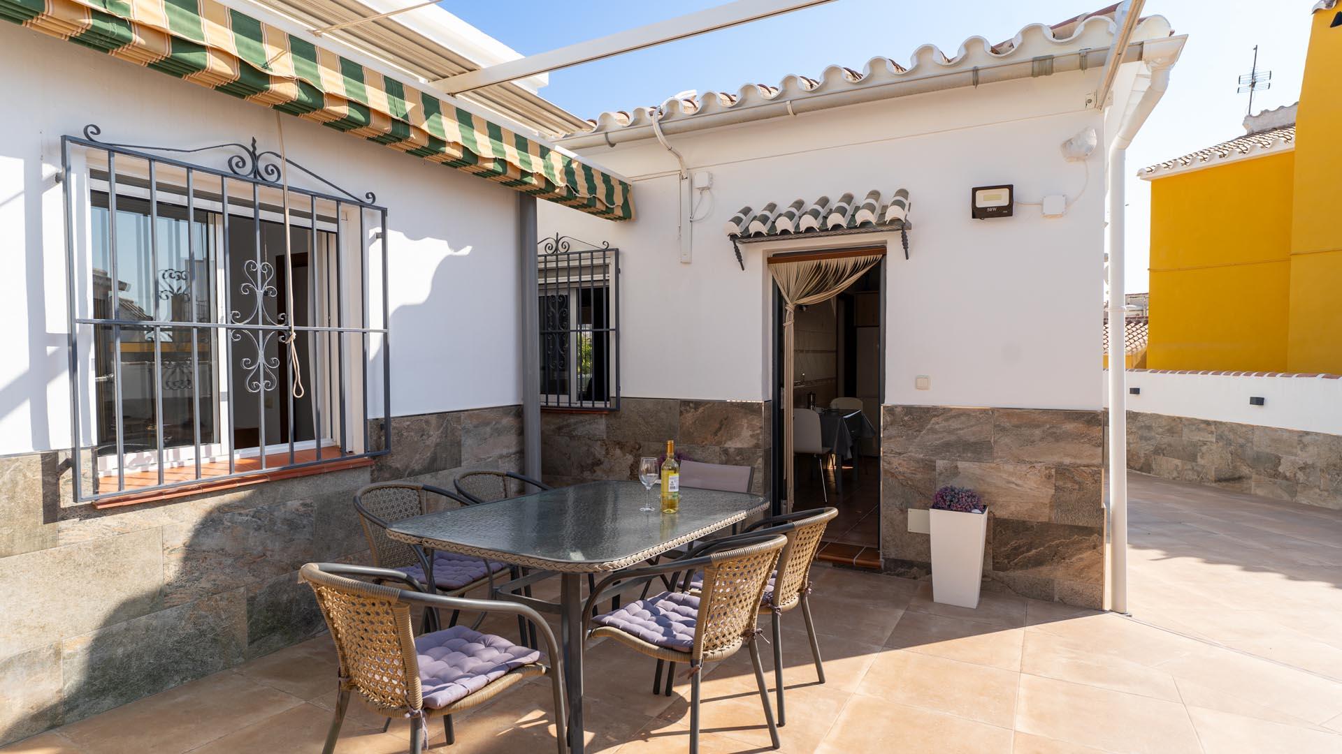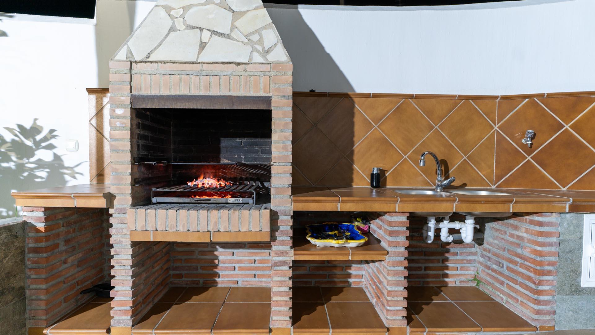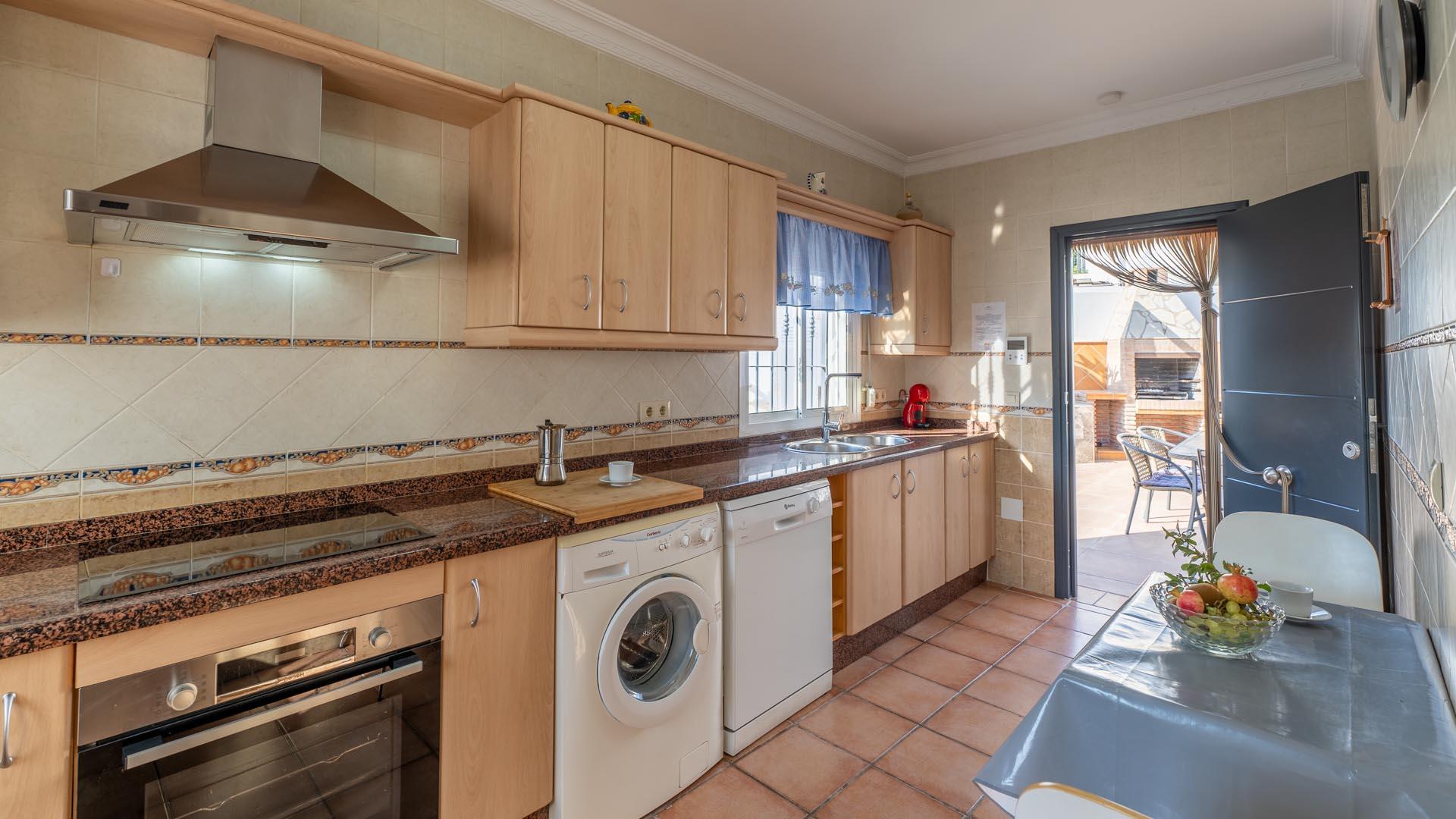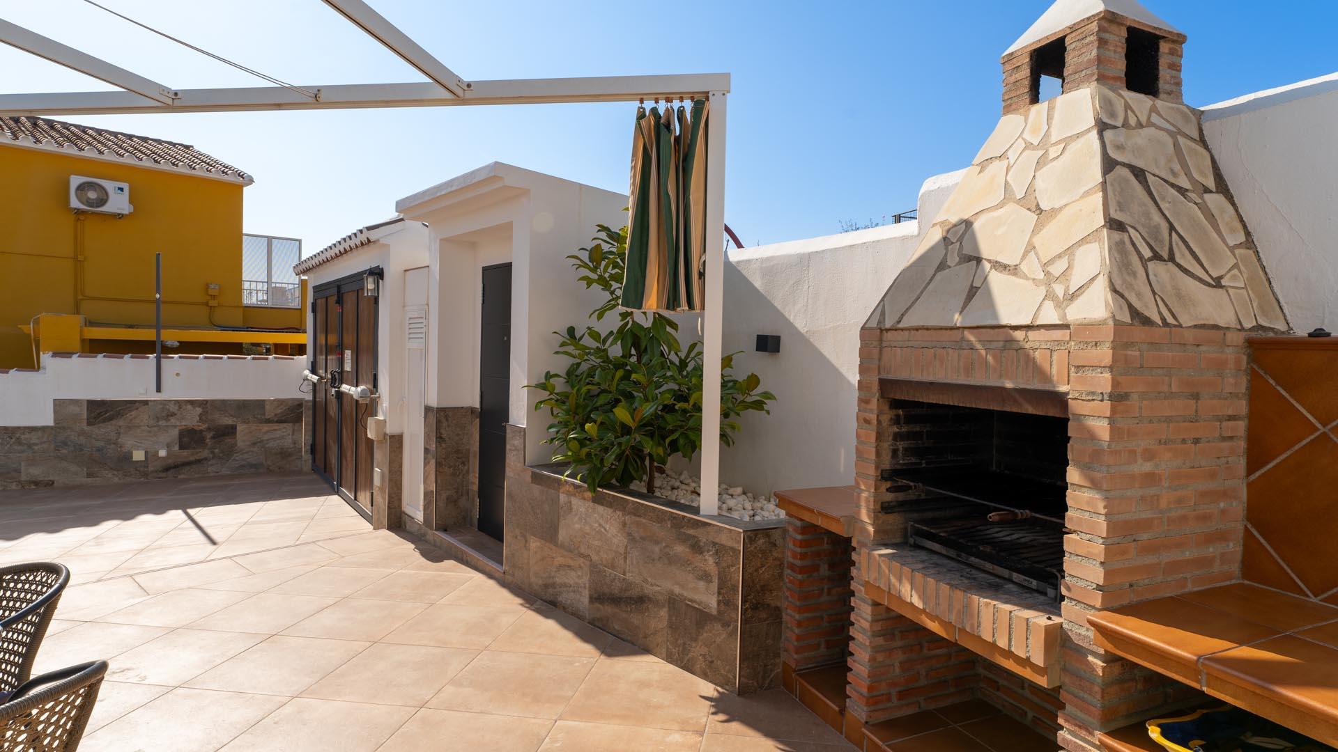 Dit vakantiehuis heeft aan de voorkant een mooie veranda vanwaar u uitkijkt over Nerja en de Middellandse Zee- een ideale plek om te genieten van uw ontbijt of diner. Een paar traptreden naar beneden leiden naar de grastuin en het privé zwembad (6,5m x 3,5m lang and 1.25m – 2.20m diep), met ligstoelen. Aangrenzend aan het huis vindt u een fijne zithoek met barbecue.