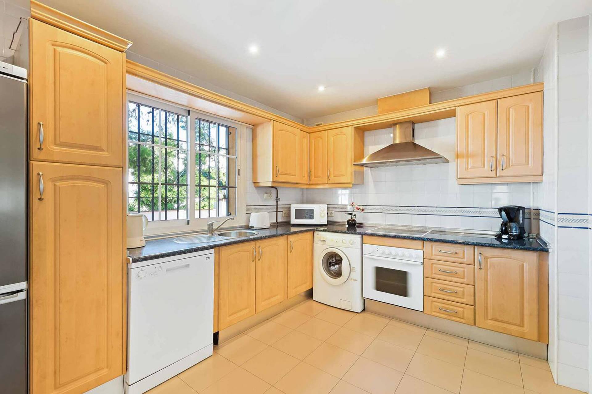 - keuken met electrisch fornuis, electrische oven, magnetron, afwasmachine, koel-vriescombinatie, koffiezetapparaat, broodrooster en citruspers