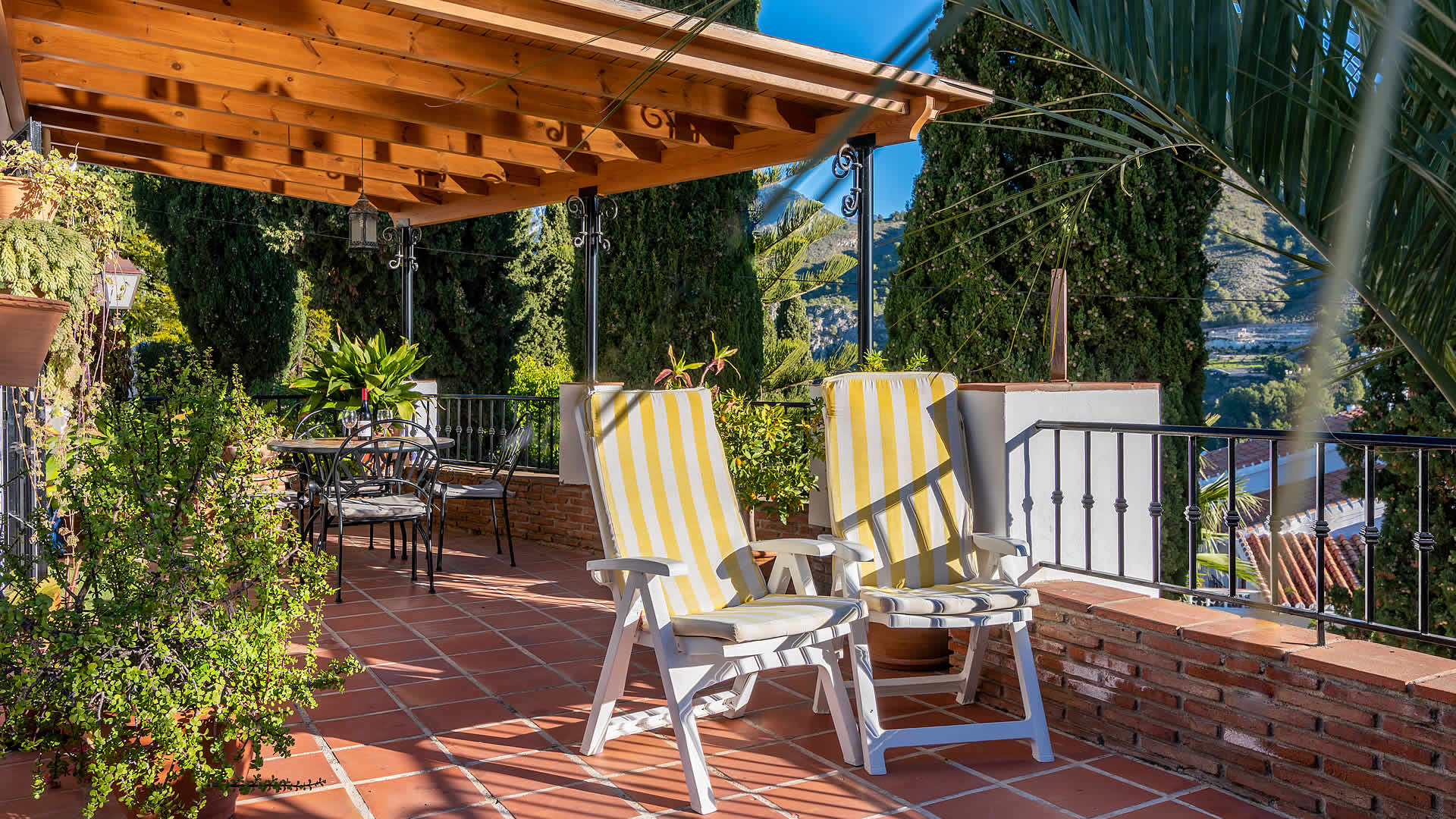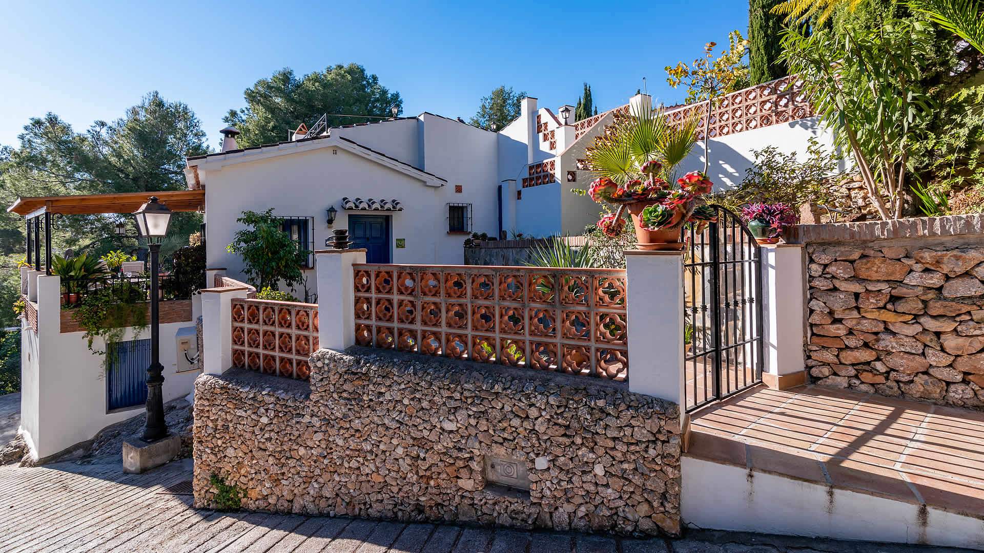 Via de ruime, zonnige patio, gemaakt van handgemaakte bakstenen, komt u het huis binnen. Buiten zorgen potplanten en rechts de kleine tuin voor een authentieke mediterrane sfeer, een sfeer die binnen benadrukt wordt door de blauw geschilderde houten deur en bijpassende raamkozijnen. Achter de blauwe deur bevinden zich de eetkamer, keuken, zitkamer en badkamer. Via een grote glazen deur komt u uit op een groot terras met patiomeubilair en barbecue. Vanaf dit met een pergola overdekte terras kijkt u uit over de zee, het mooie omringende landschap en over de bergen. De gunstige ligging van dit terras garandeert een perfect verblijf gedurende zowel zomer als winter. Het privé zwembad van 6 x 3 meter (1.4 - 1.8 meter diep) is uitgerust met een milieuvriendelijk ionisatiesysteem, goed voor huid en milieu! Het schitterende mozaiëk met als thema en toepasselijke naam SOL (zon) aan het eind van het zwembad is gemaakt door een plaatselijke kunstenaar. Ligstoelen, een tafel en een grote parasol zorgen voor een heerlijke plek onder de zon.