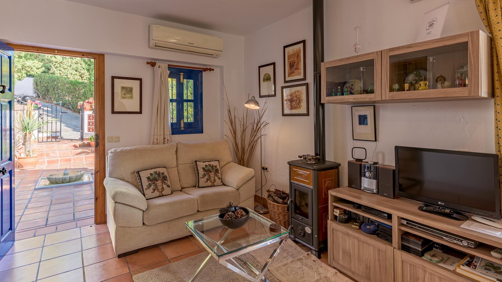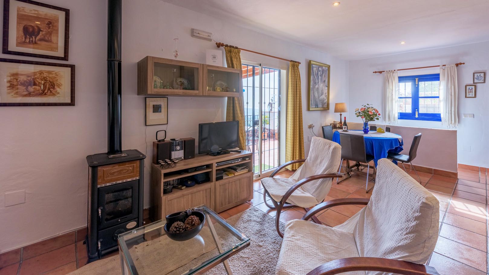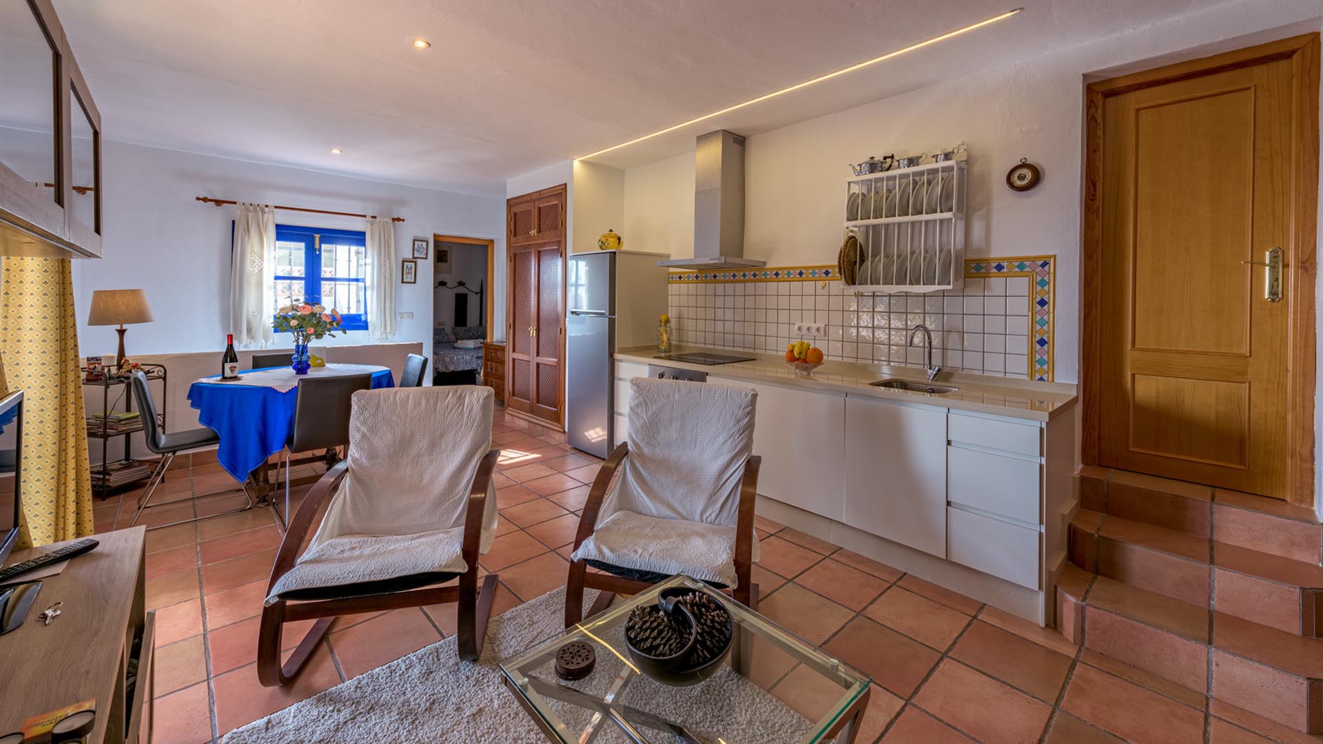 De eetkamer, met een tafel en vier stoelen, kijkt uit op de patio bij de ingang van het huis. In de zitkamer met houtkachel staat een comfortabele bank, een praktische, gemakkelijke fauteuil, een salontafel en een dressoir met televisie met Engelse zenders. Tevens vindt u er een DVD/Cd-speler/radio met een verzameling films en muziek.