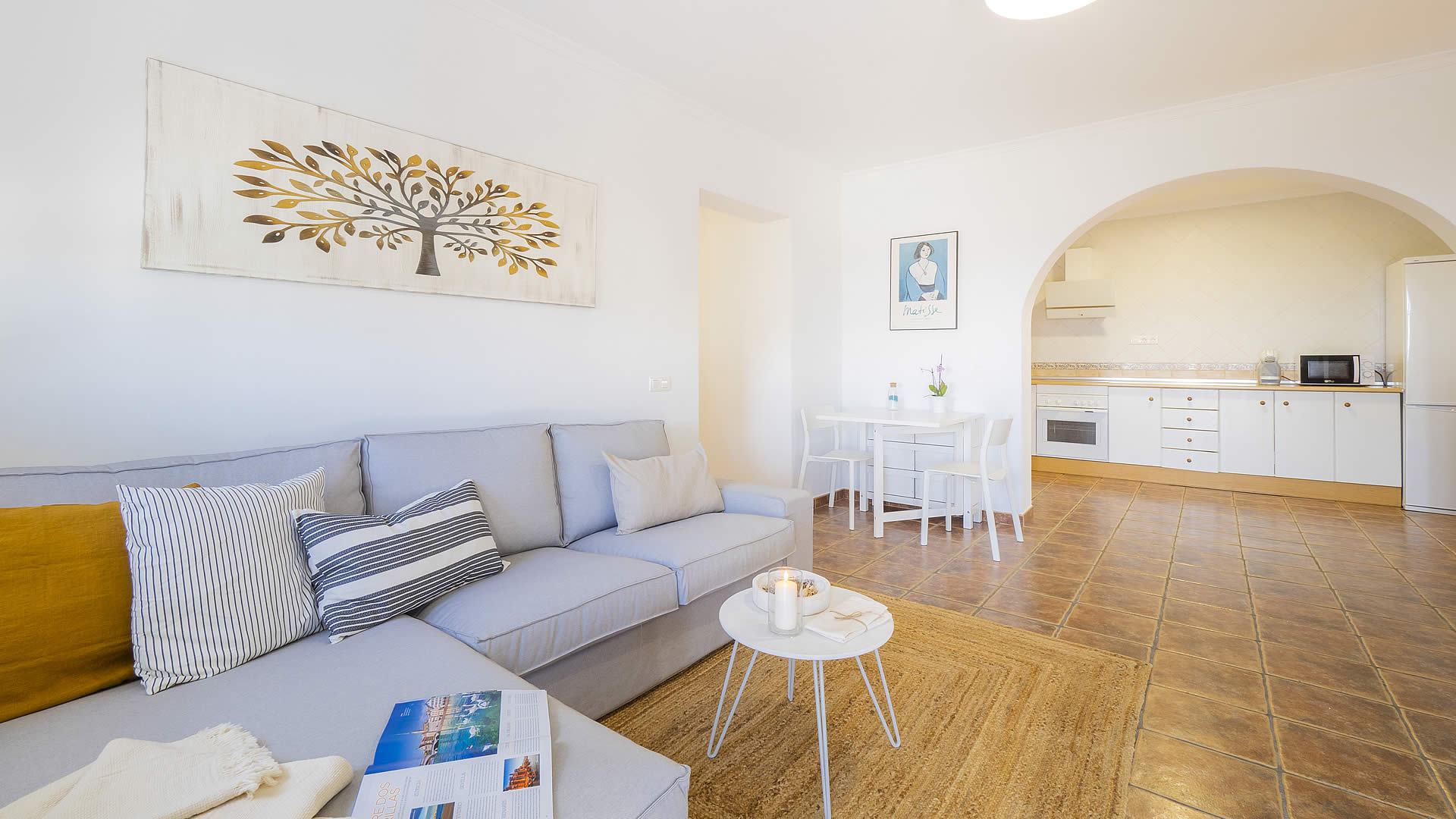In dit huis is het interieur licht, eenvoudig en functioneel. Alle kamers liggen op één verdieping met een zitkamer die overloopt in de keuken. De zitkamer is voorzien van een bank, fauteuils, een open haard en satelliet tv. De keuken is compleet uitgerust met een 4-pits keramische kookplaat, een koelkast/vriezer, oven, wasmachine en een vaatwasser. De ouderslaapkamer heeft een tweepersoonsbed en een eigen badkamer. De twee andere slaapkamers hebben beiden twee aparte bedden en een badkamer voor gezamenlijk gebruik. Voor de koelere dagen buiten het zomerseizoen zijn elektrische radiatoren beschikbaar.