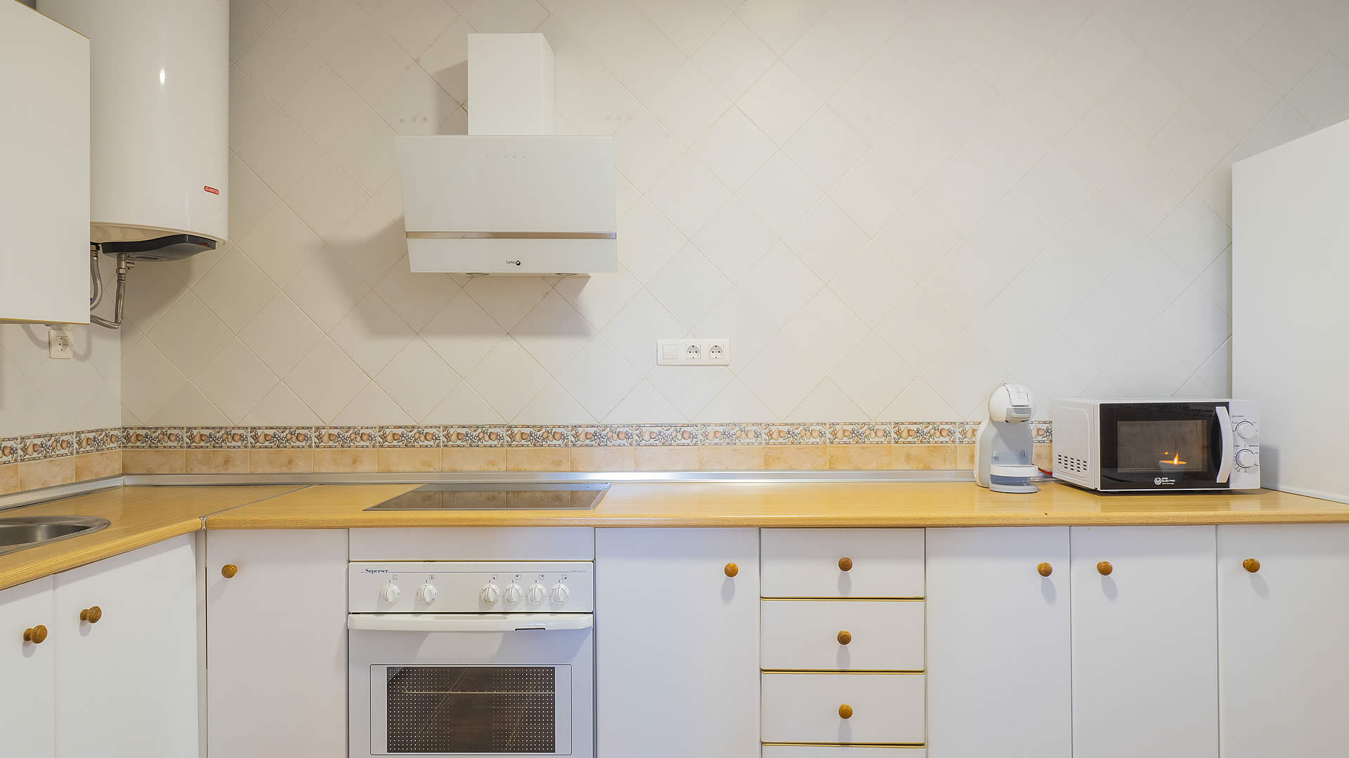 • open keuken met electrisch fornuis, electrische oven, magnetron, afwasmachine, koel-vriescombinatie, koffiezetapparaat, broodrooster en citruspers